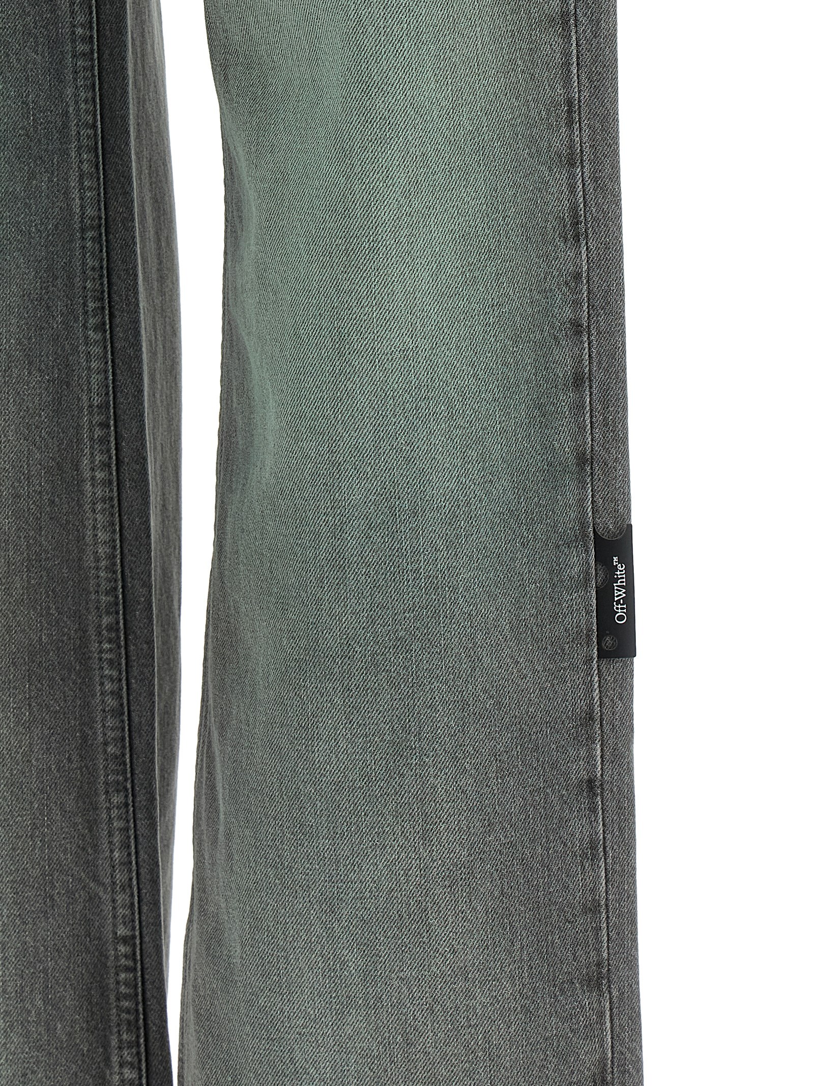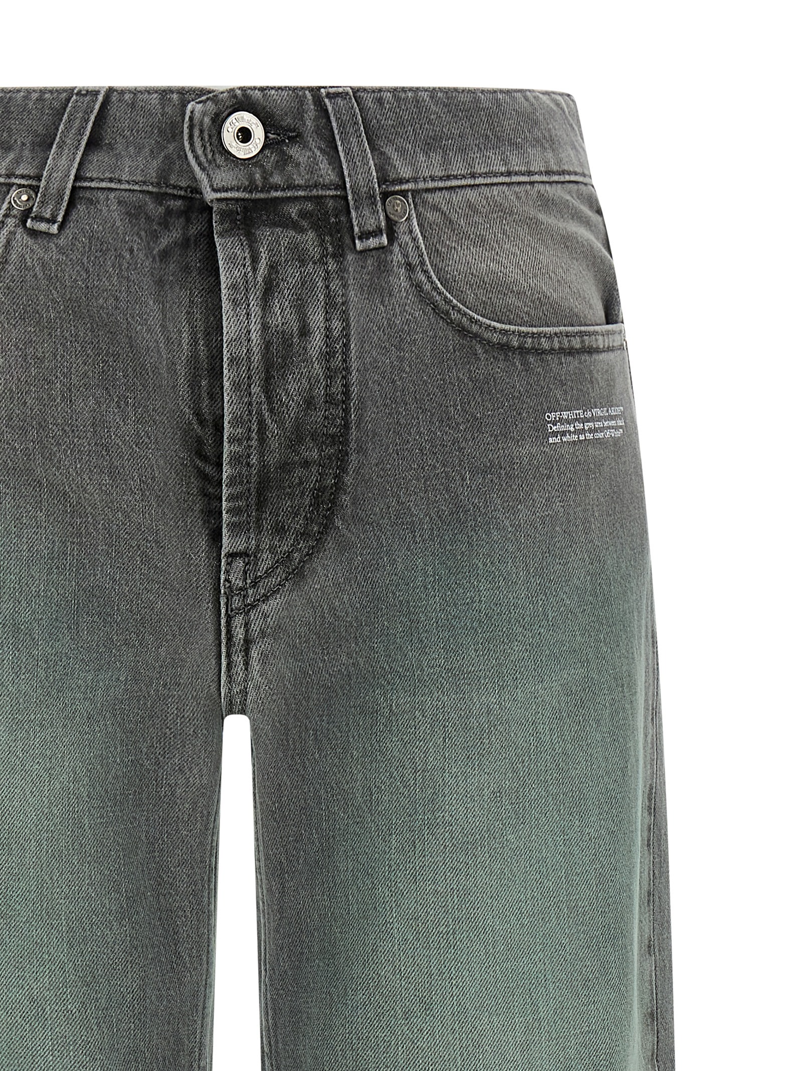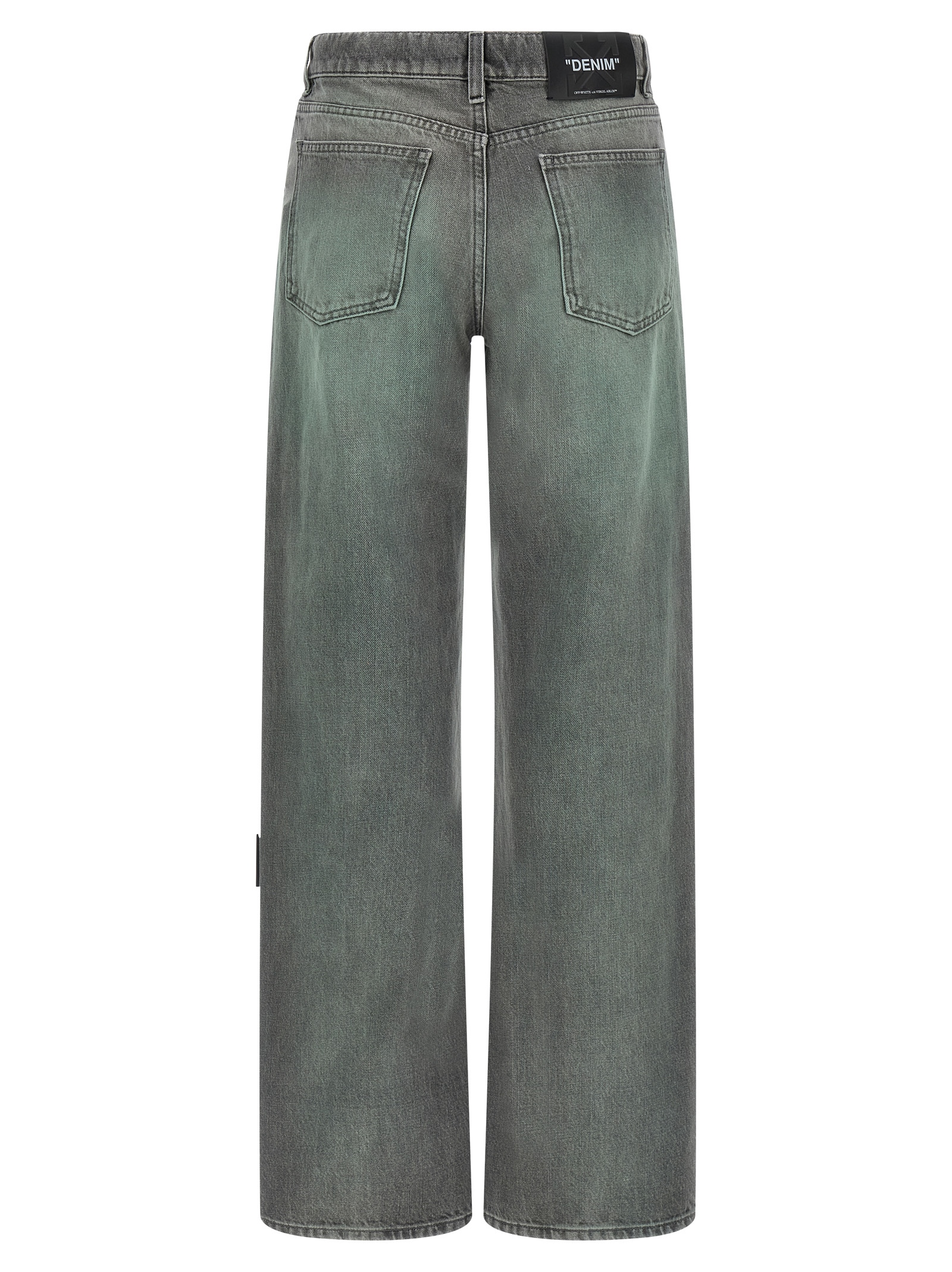 ‘spray susy’ cotton denim jeans with spray halos on the front and back, Wide and straight leg, Front button print and closure, Five pockets, Back logo tag.