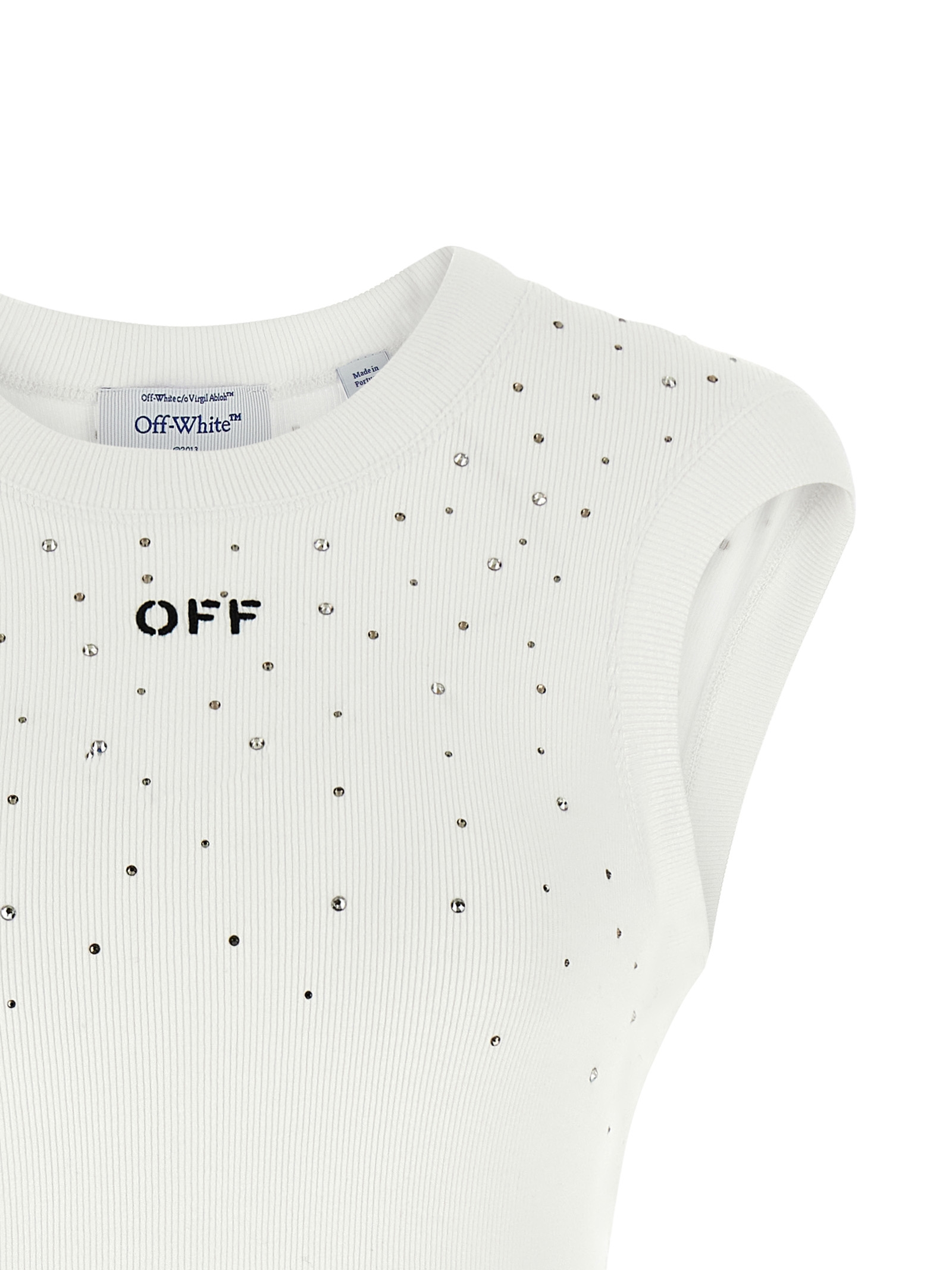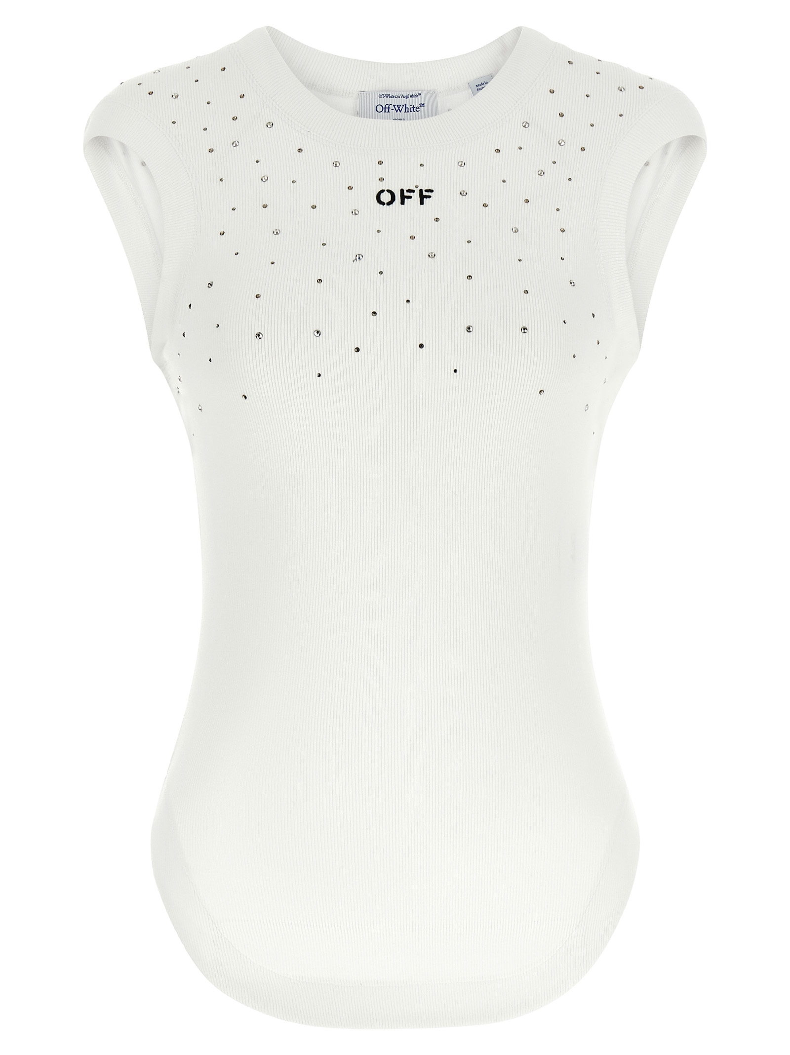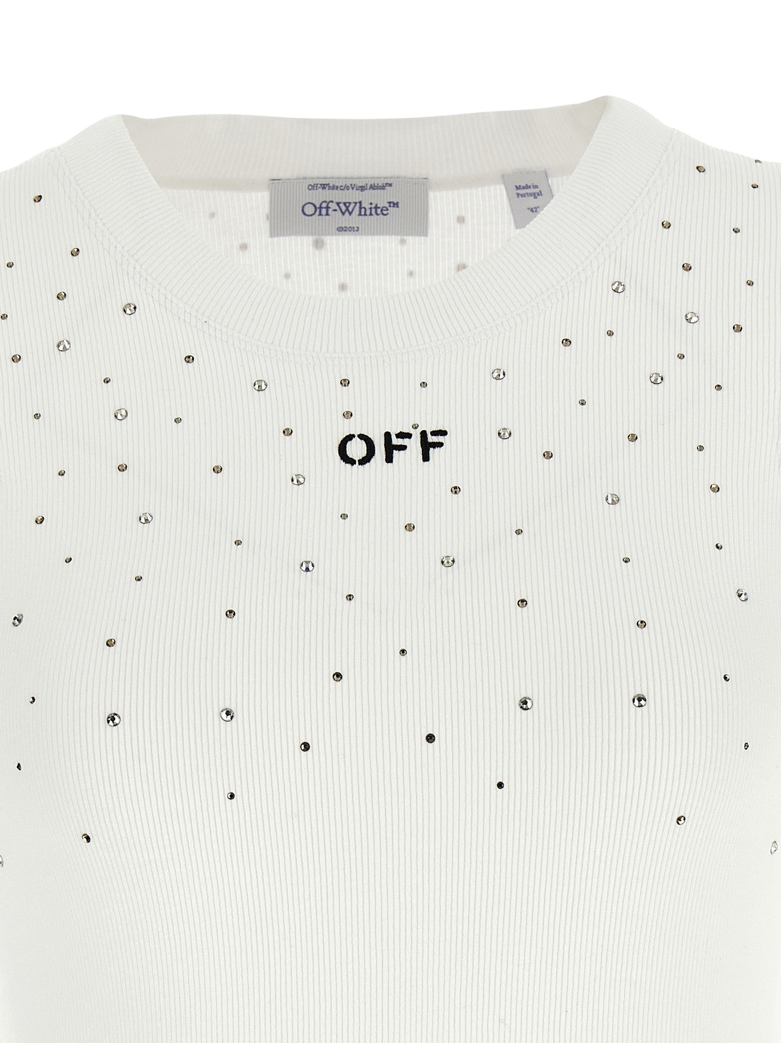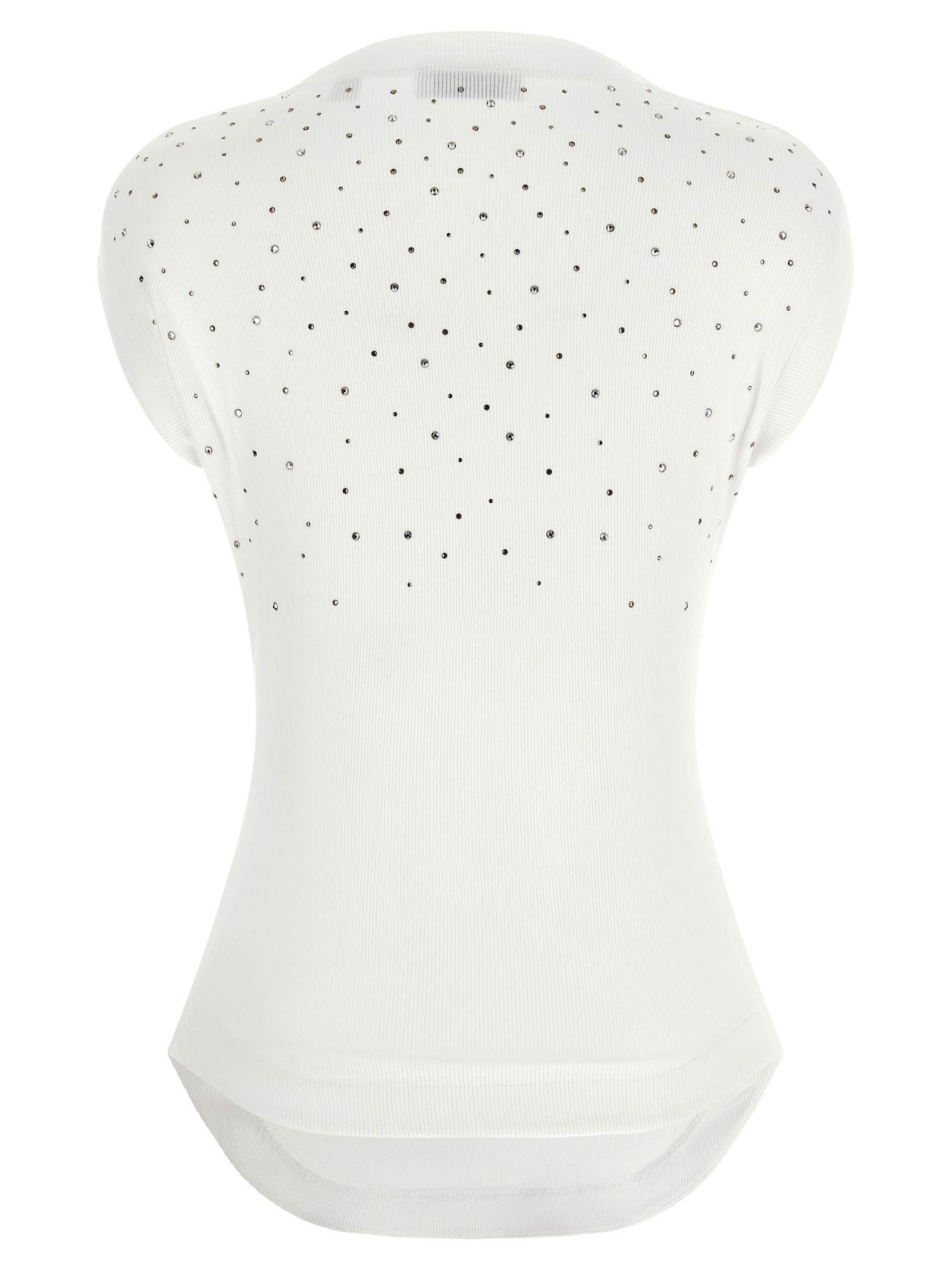 Ribbed stretch viscose jersey top with swarowski application on the front and back, Crew neck, Rounded and asymmetrical hem. Size and Fit – true to size fit