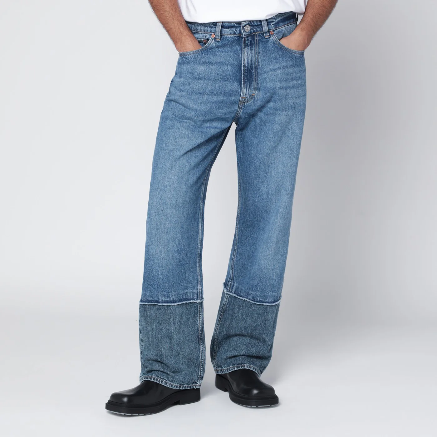 Our Legacy cotton denim jeans, featuring wide straight leg, relaxed fit, YKK zip closure, five pockets, and logo patch on the back.