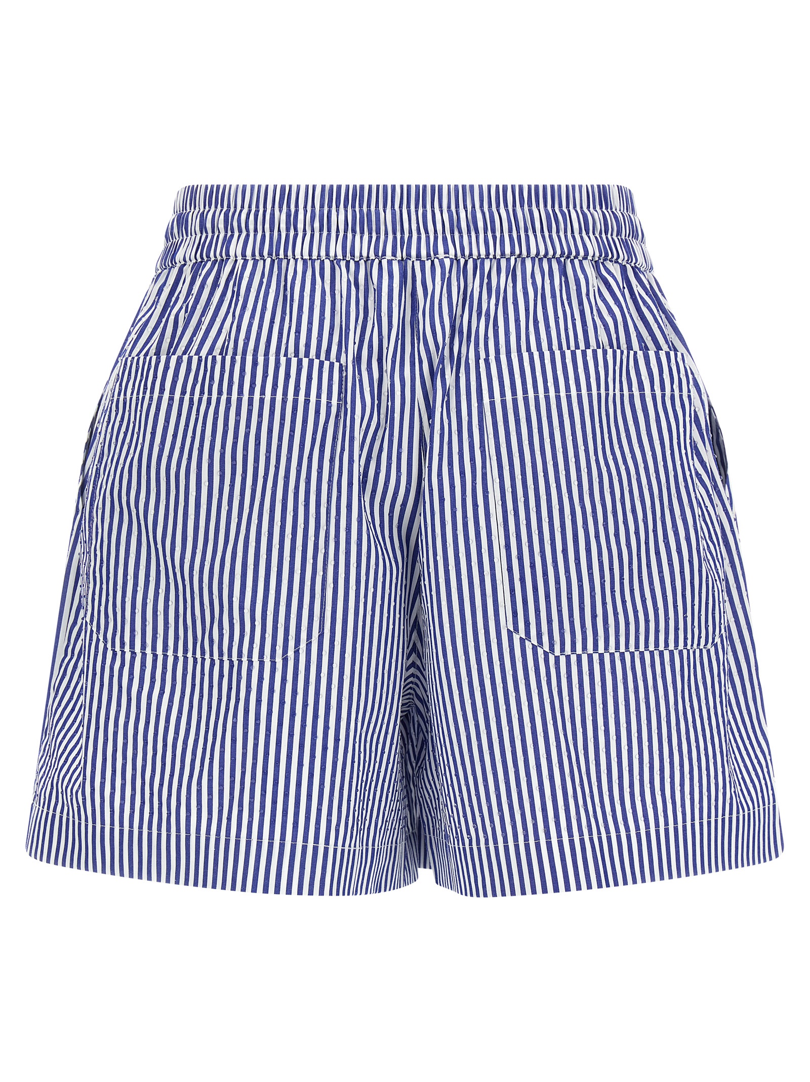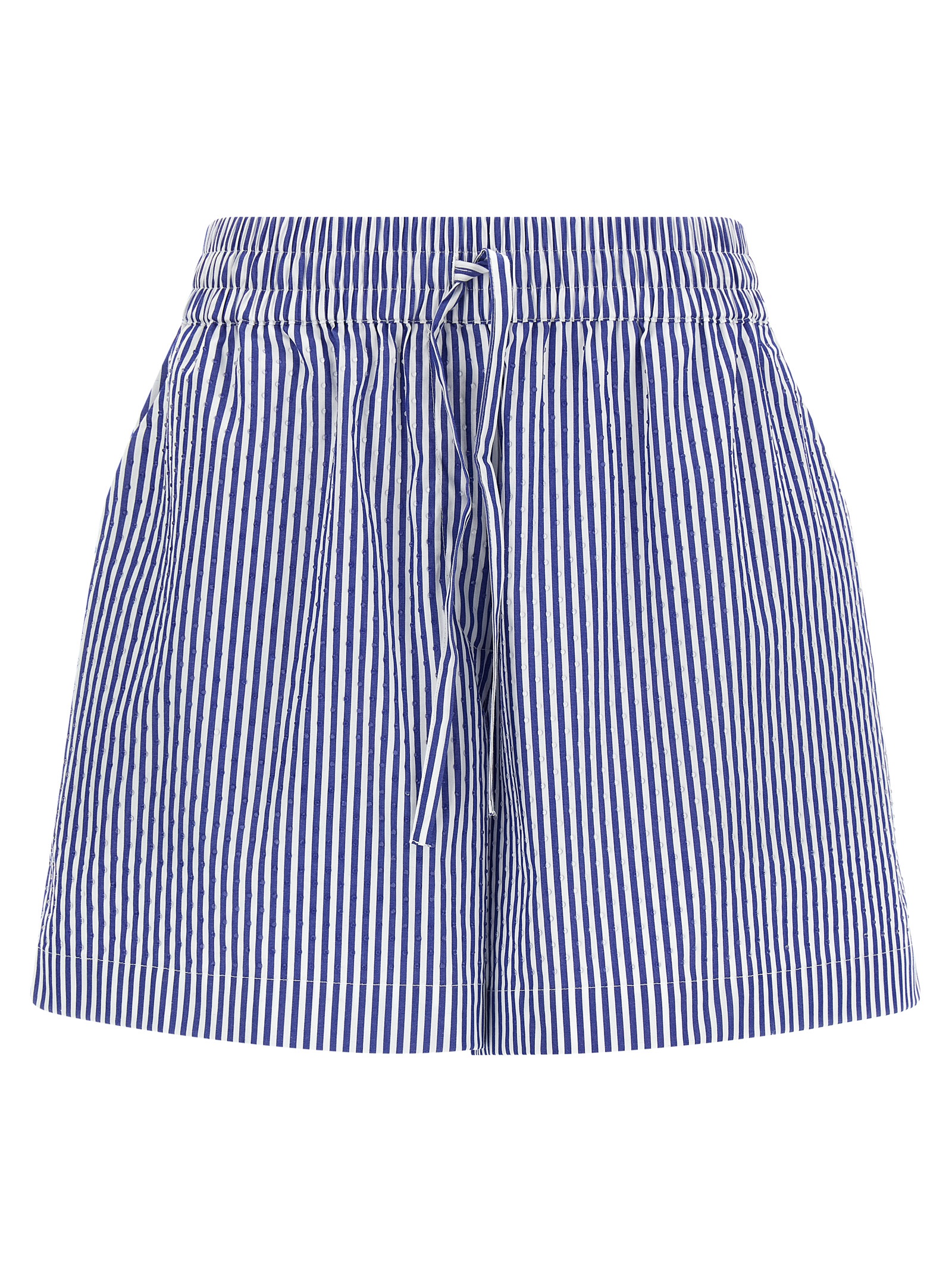 ‘cashine’ striped cotton poplin shorts with all-over rhinestones, Wide leg, Drawstring elastic waistband, Pockets. Size and Fit – true to size fit