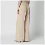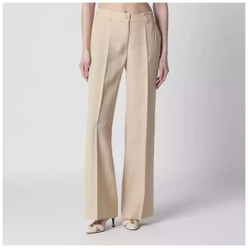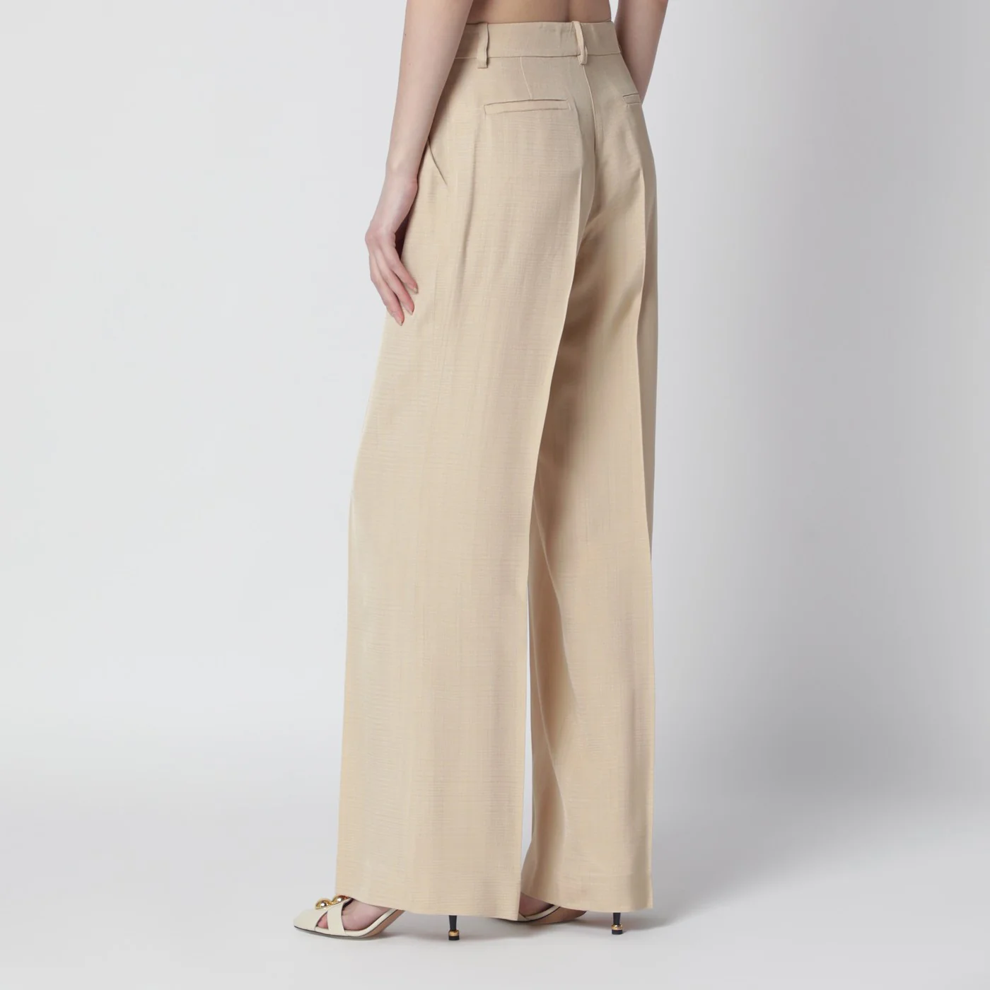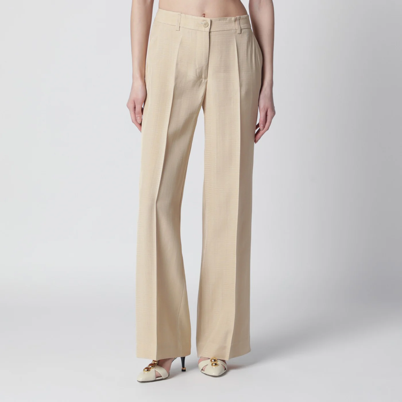 Trousers by PAROSH in champagne colored viscose front zip and button closure belt loops two side pockets two back welt pockets wide leg front and back crease. Size and Fit – Model wears size S Model measurements: Height: 181 cm Chest: 81 cm Waist: 62 cm Hips: 89 cm