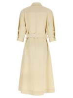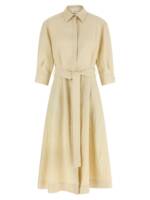 Shirt-style dress in linen blend with shirt collar, Front closure with covered buttons, Removable and knotted belt at the waist, And side pockets. Size and Fit – True to size fit