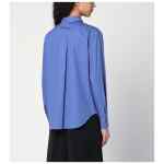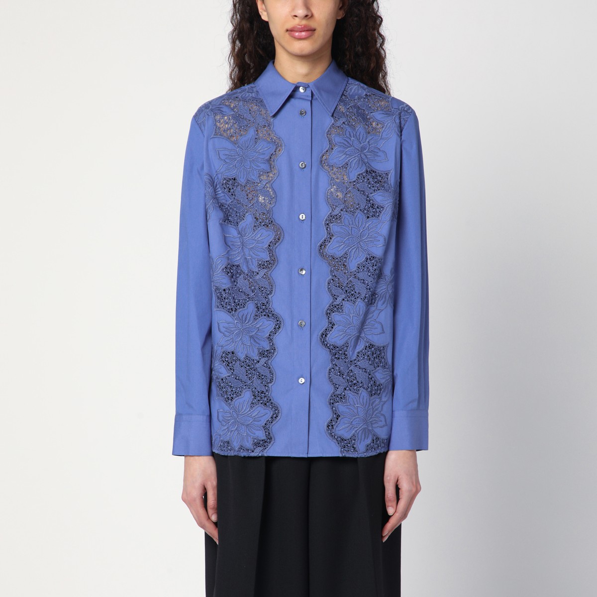 P.A.R.O.S.H. shirt in light blue cotton poplin, characterized by front buttoning, long sleeves with buttoned cuffs, classic collar, curved hem, and tone-on-tone floral embroidery on the front.