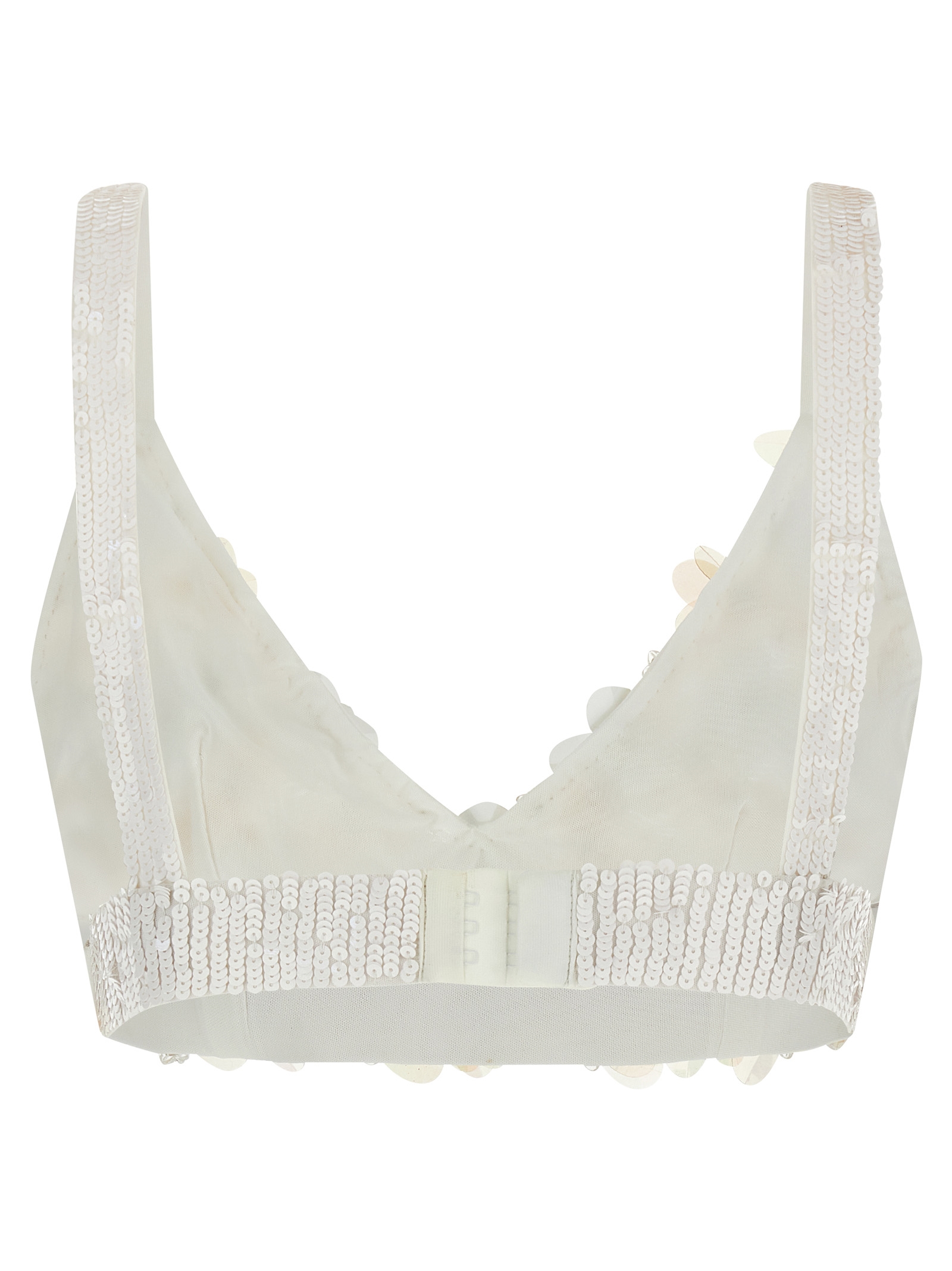 Gym’ fabric top with all-over 3d floral embroidery, Crop bralette style, V-neck, Wide shoulder straps and sequined back, And back hook closure.