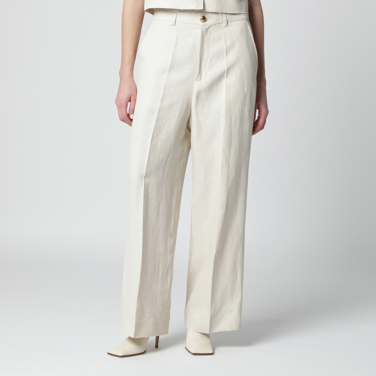Sand-colored linen-blend palazzo trousers by P.A.R.O.S.H., featuring belt loops, button and zip fastening, side pockets and rear welt pockets with buttons.