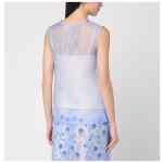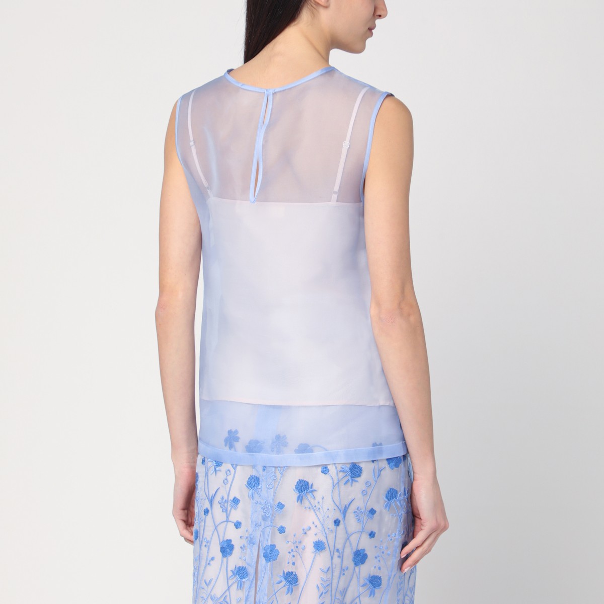 Sleeveless crew neck tank top by P.A.R.O.S.H. in sky blue silk, characterized by a double-layer design, an inner tank with a V-neck, a semi-transparent outer tank, and a cut-out at the back.