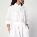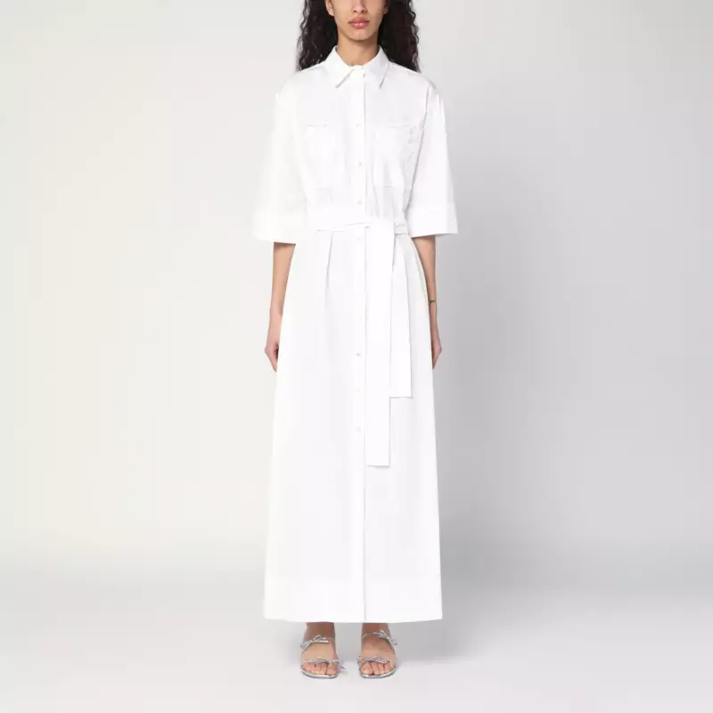 Long shirt dress by P A R O S H in white cotton characterized by a shirt collar three quarter sleeves a waist belt front buttoning two side welt pockets and two embroidered pockets applied on the chest.