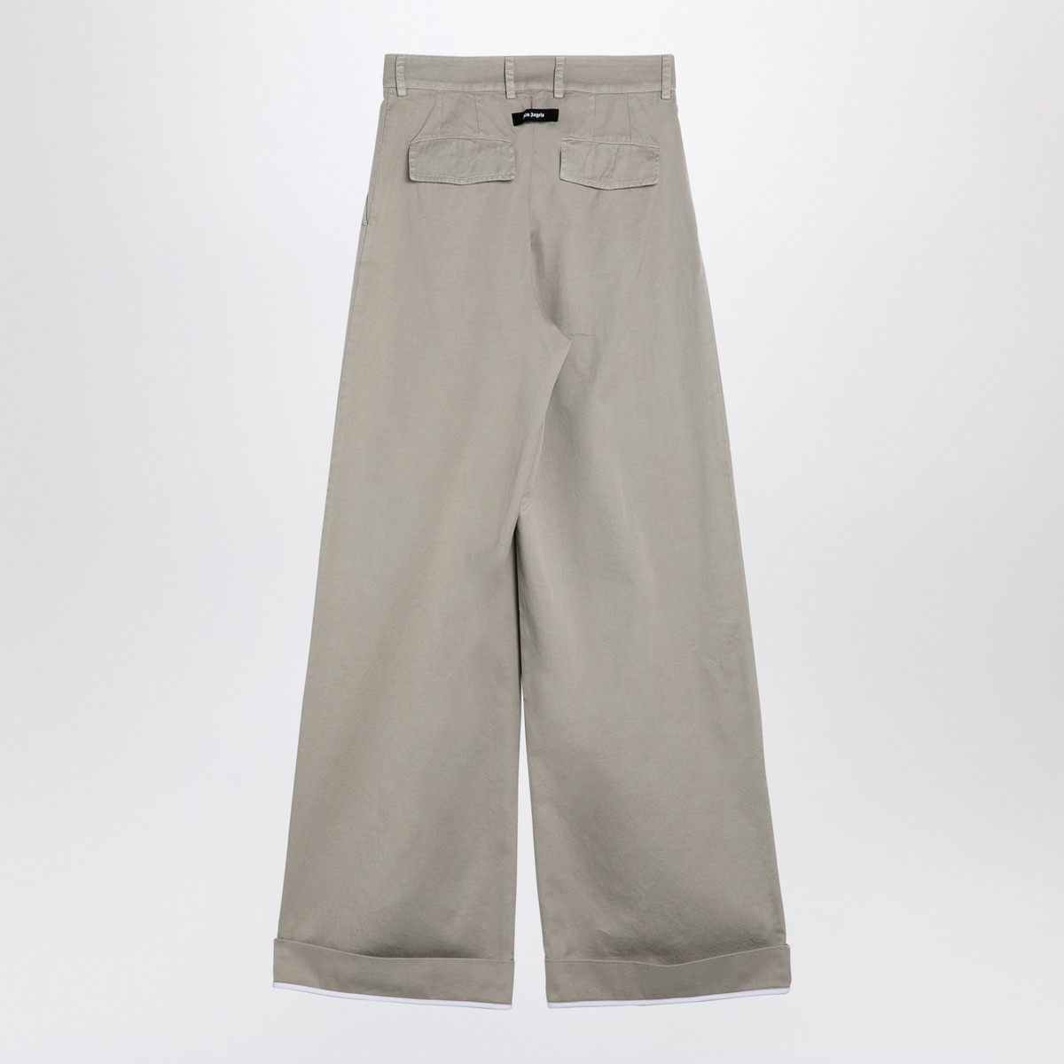 Beige cotton wide leg trousers from Palm Angels featuring a front zip and hook fastening, belt loops, two side welt pockets, two back flap pockets and logo patch on the back.