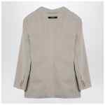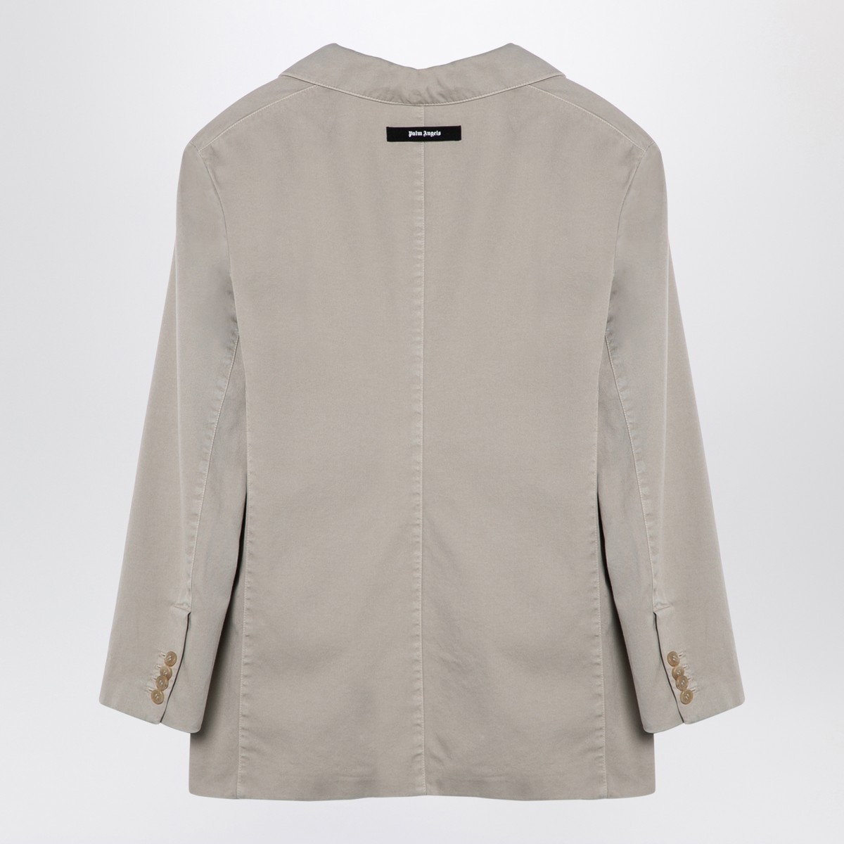 Beige cotton double-breasted jacket from Palm Angels featuring a front button placket, classic lapels, two patch pockets on the front, long sleeves with buttoned cuffs and logo patch on the back.