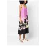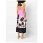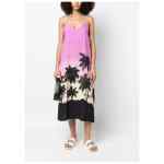 sunset-print midi dress from PALM ANGELS featuring black, light purple, palm tree print, strap detailing, V-neck, shift style and calf-length. Sunset print midi dress