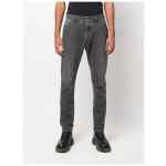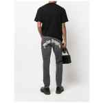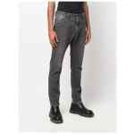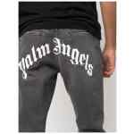 Faded black cotton blend logo-print straight-leg jeans from PALM ANGELS featuring mid-rise, belt loops, front button and zip fastening, classic five pockets, logo print to the rear, straight leg and slim cut. Curved Logo denim jeans
