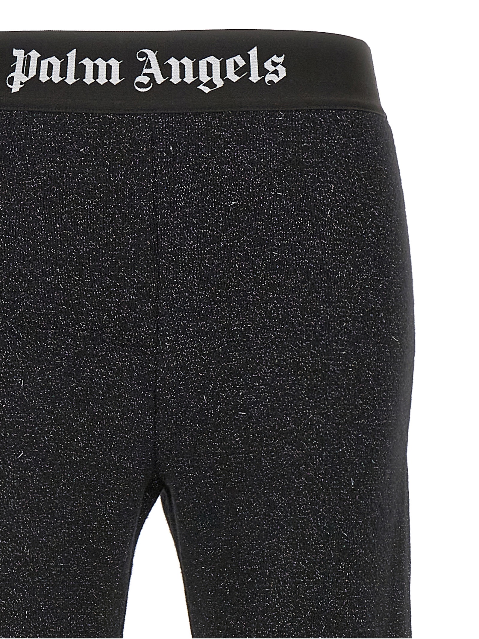 ‘Logo Tape’ lurex knit pants, elastic waistband with jacquard logo, flared leg.