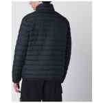 Parajumpers black short quilted down jacket in matte, water-repellent polyester taffeta, featuring a double front zip closure, three zip pockets, one internal pocket with Velcro, elasticated hem and cuffs, long sleeves including one with logo patch, and stand collar with yellow elastic tape.