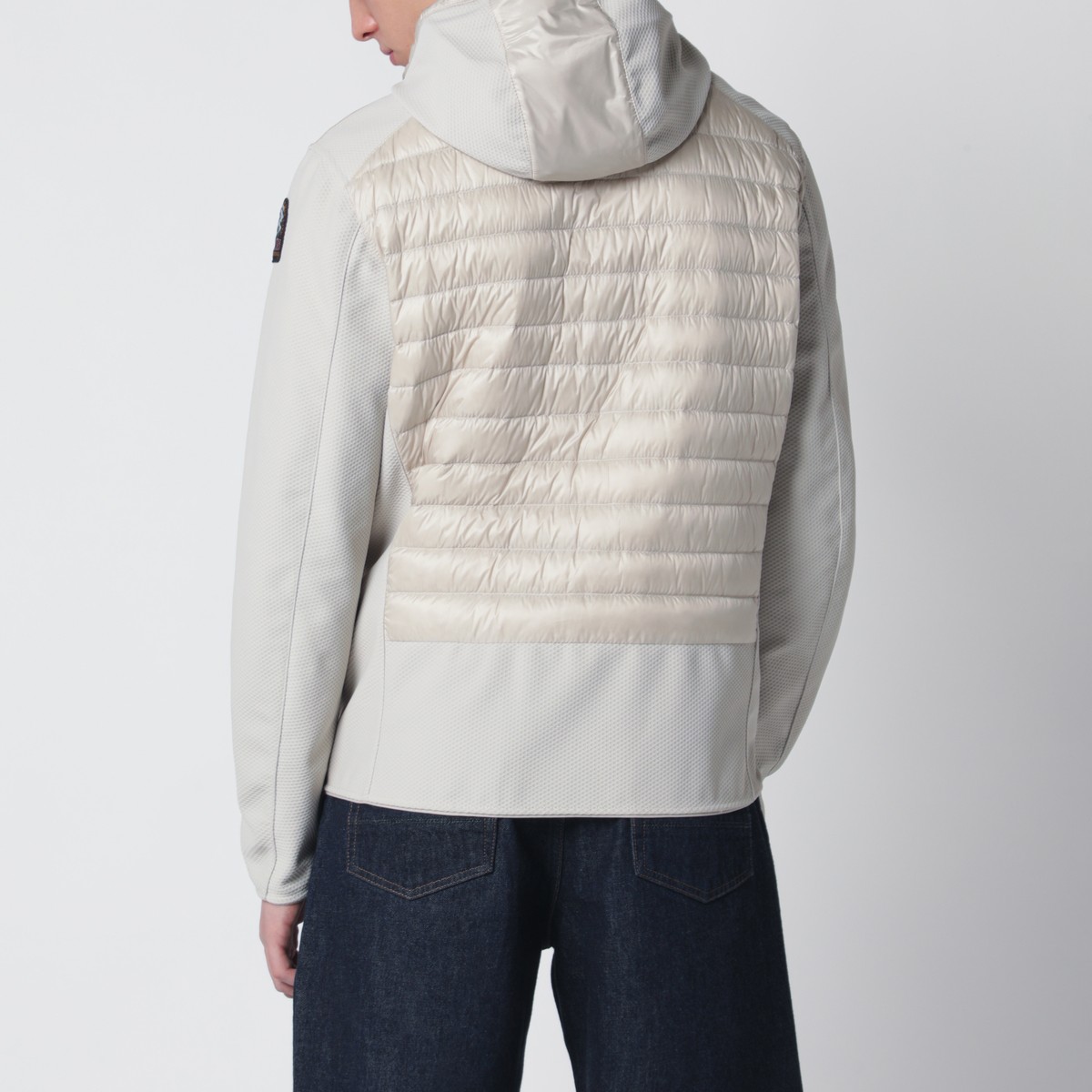 Parajumpers Pelican-colored padded jacket in stretch polyester honeycomb and semi-gloss nylon taffeta, featuring a double front zip closure, hood with drawstring and yellow elastic tape, long sleeves including one with logo patch, two side pockets, and one zip chest pocket.