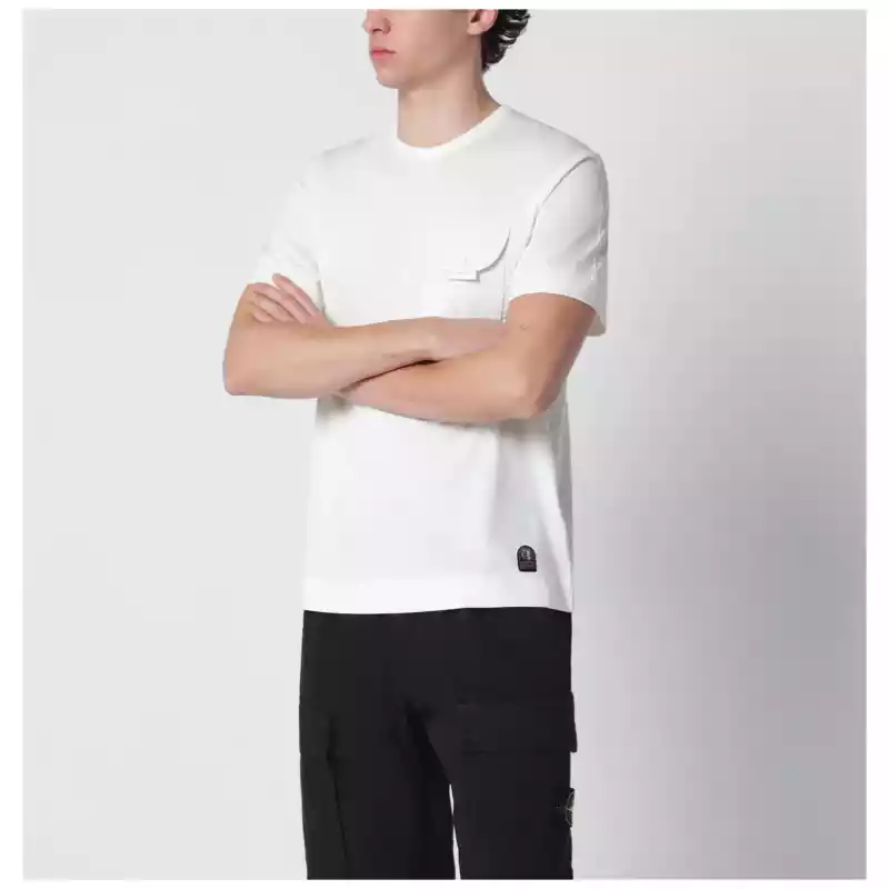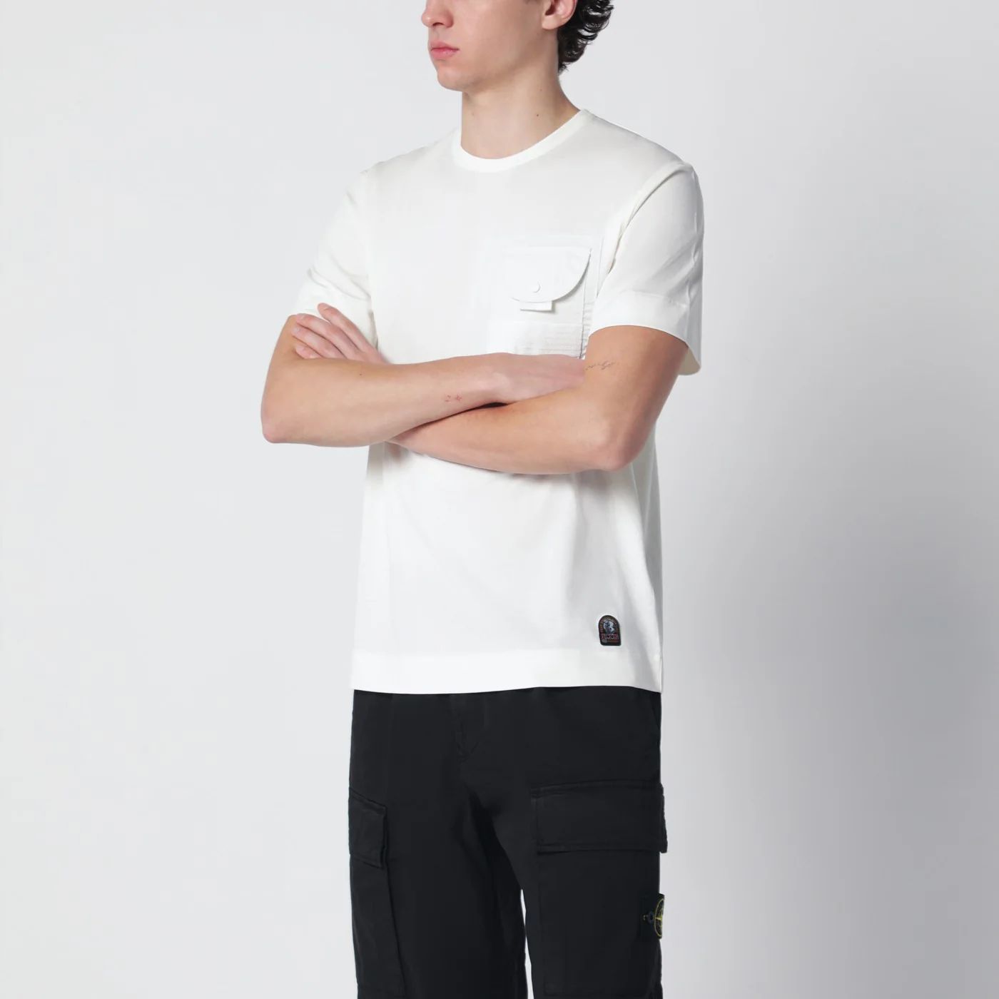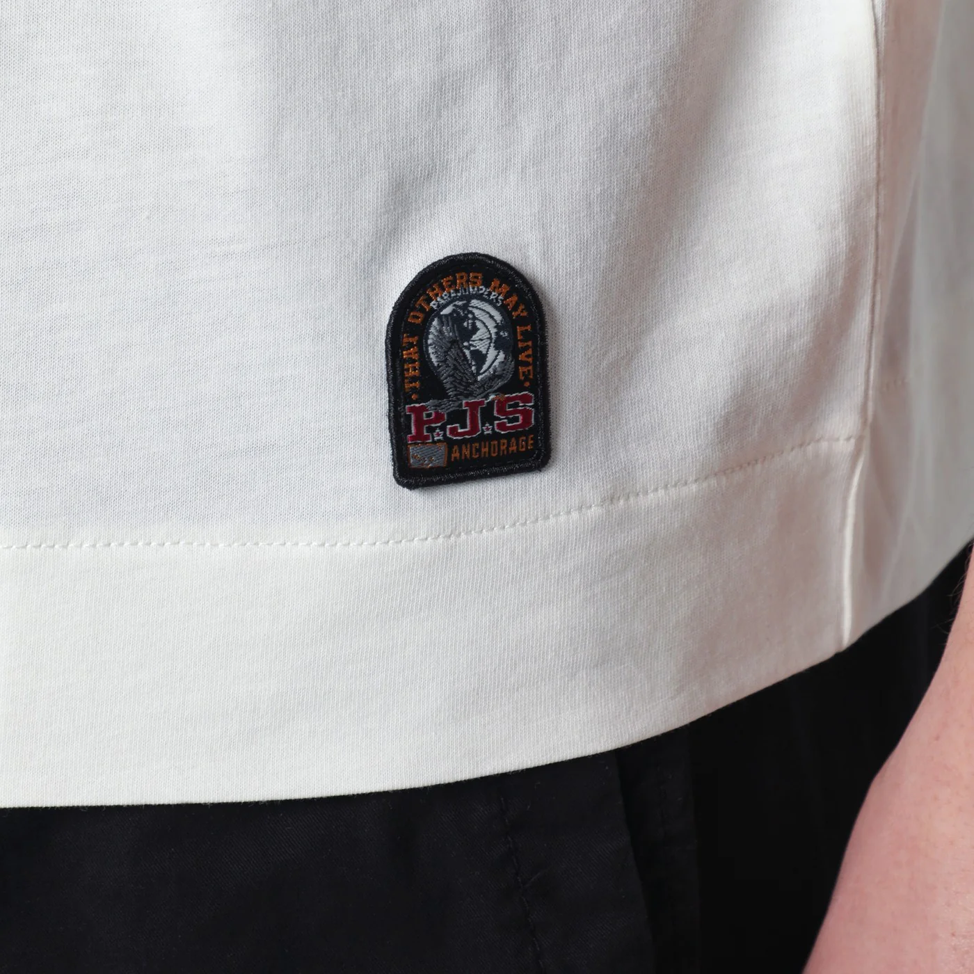 T shirt by Parajumpers in white cotton jersey short sleeves ribbed crew neck logo patch on the front one matte finish nylon flap pocket with button on the chest. Size and Fit – Model wears size L Model measurements: Height: 185 cm Chest: 92 cm Waist: 74 cm Hips: 94 cm