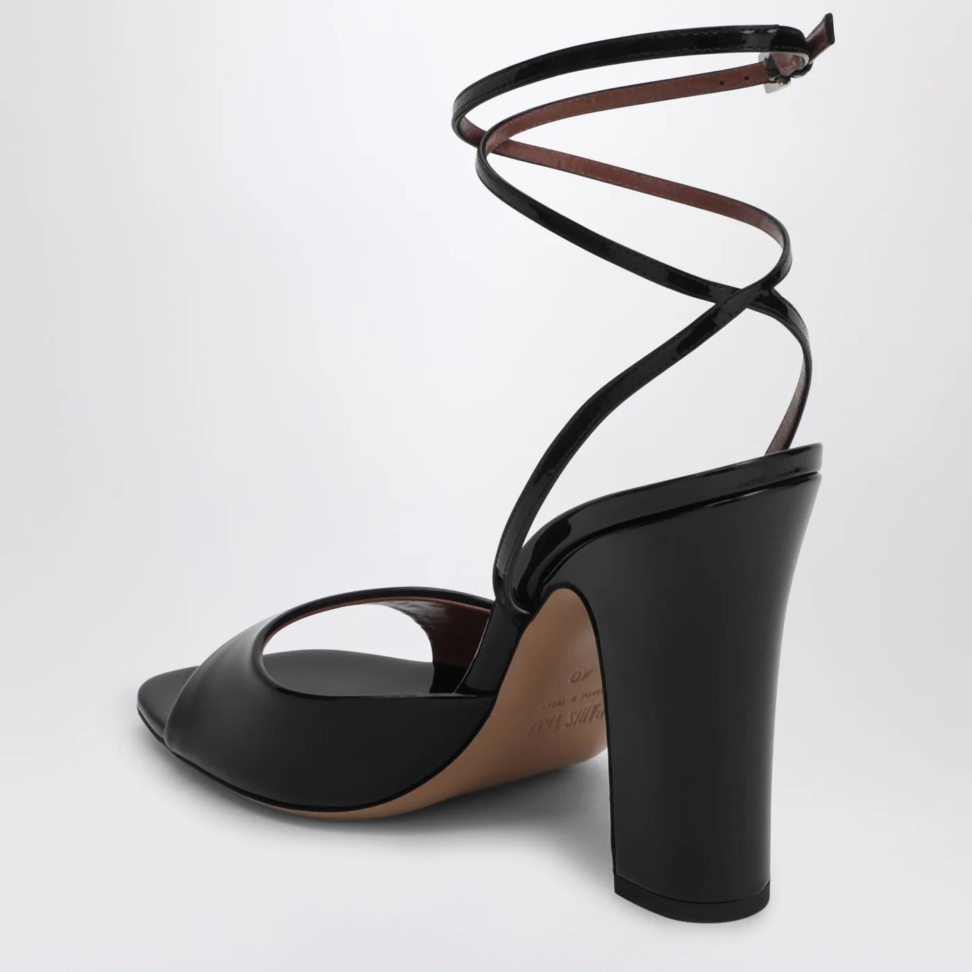 High-heeled sandal by Pars Texas in black patent leather featuring an open toe ankle strap with buckle branded insole thick high heel and leather sole.