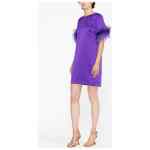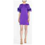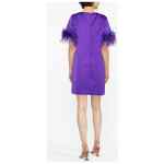 feather-trim satin dress from P.A.R.O.S.H. featuring violet purple, ostrich feather, satin finish, shift style, feather-trim detailing, round neck, concealed rear zip fastening, short sleeves and straight hem. Feathered mini dress