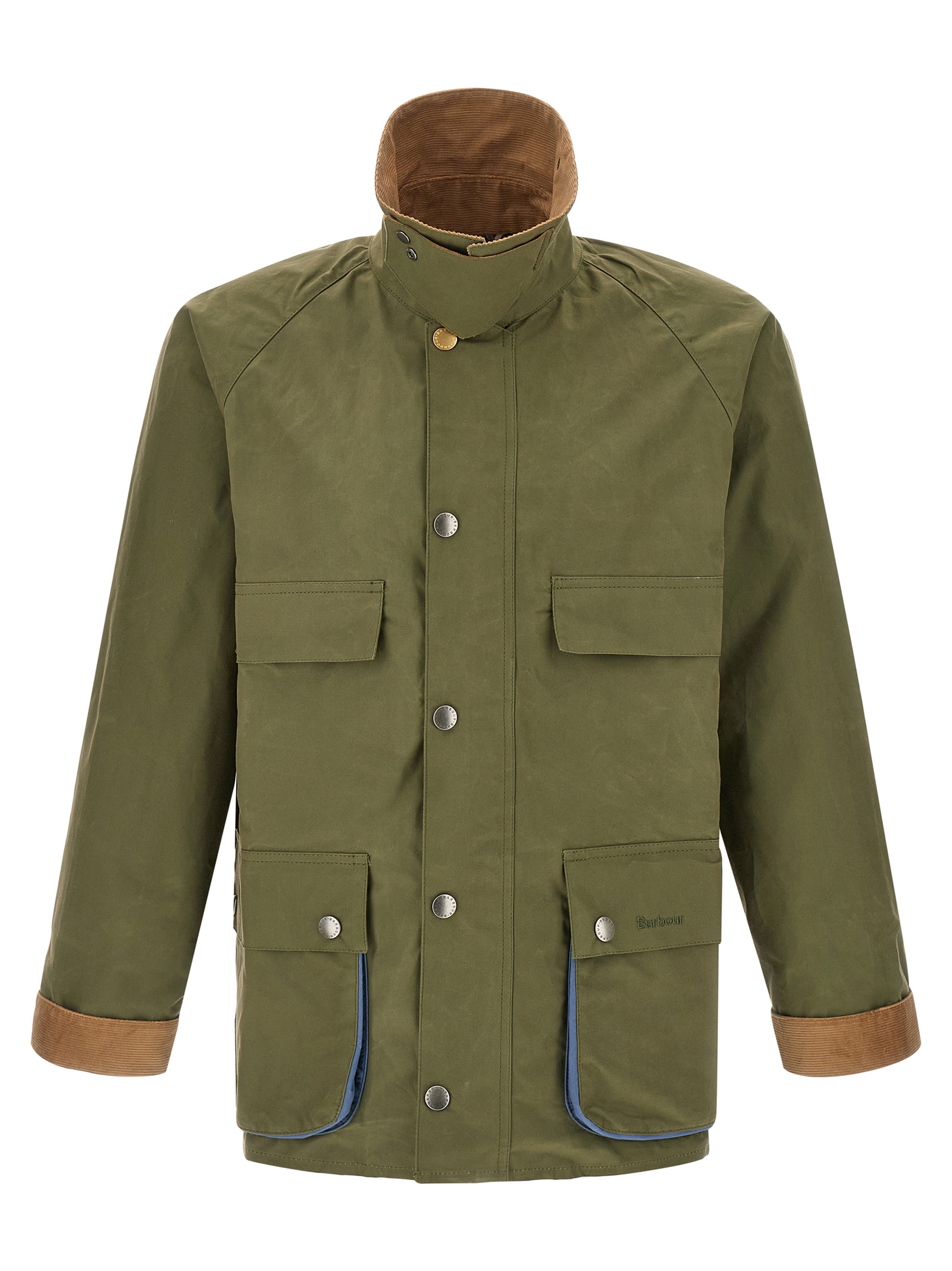 Paul Smith loves Barbour ‘Sugarlump Bedale’ waxed cotton jacket with contrast corduroy shirt collar with chinstrap, half inner lining with print, tone-on-tone front logo embroidery, flap and snap pockets, front zip and button closure, contrast appliqué details with iconic ‘Paul Smith striped pattern’, long sleeves with turned-up cuffs with ribbed velvet finish.