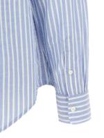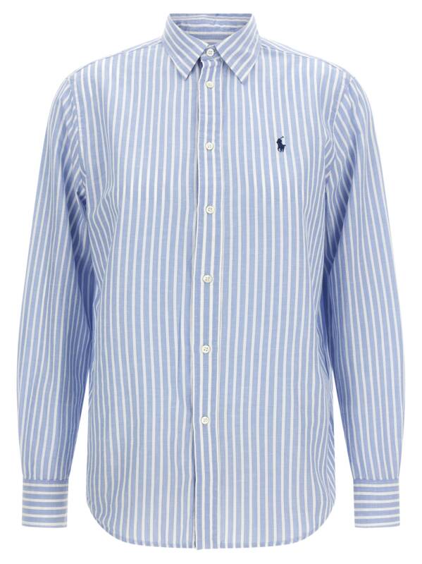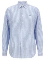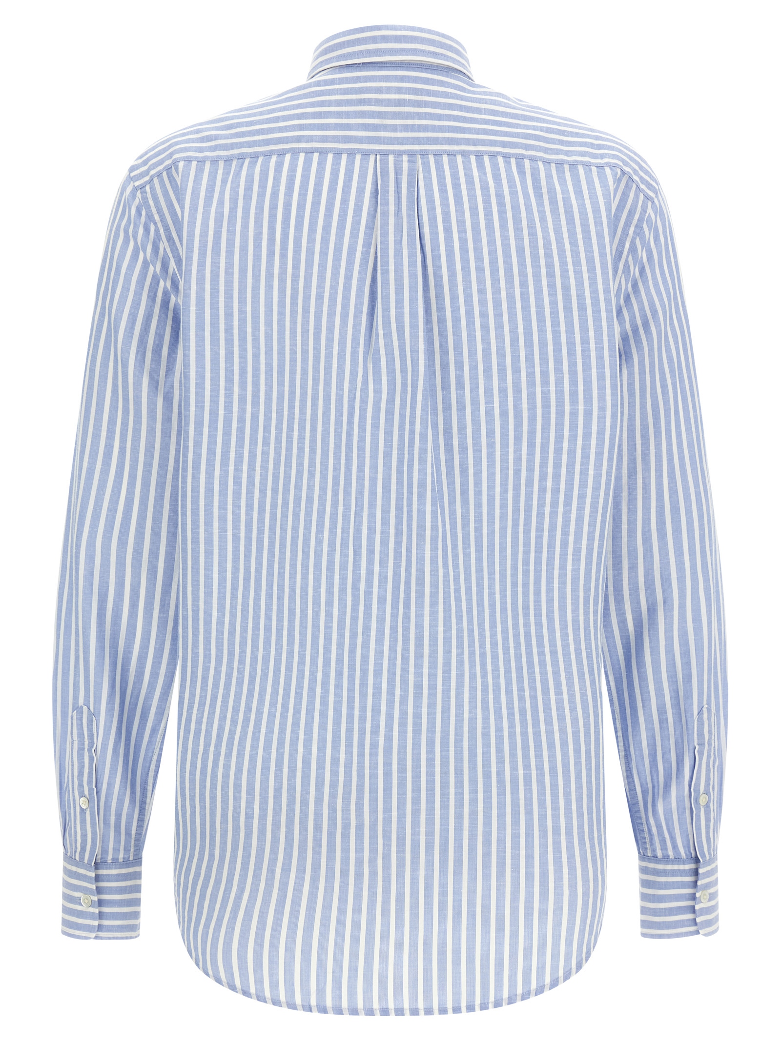 Straight cotton and linen shirt with pointed collar, Front closure with cannon and mother-of-pearl buttons, Front logo embroidery, Back rack with cannon crease, Long sleeves with cuffs and button.
