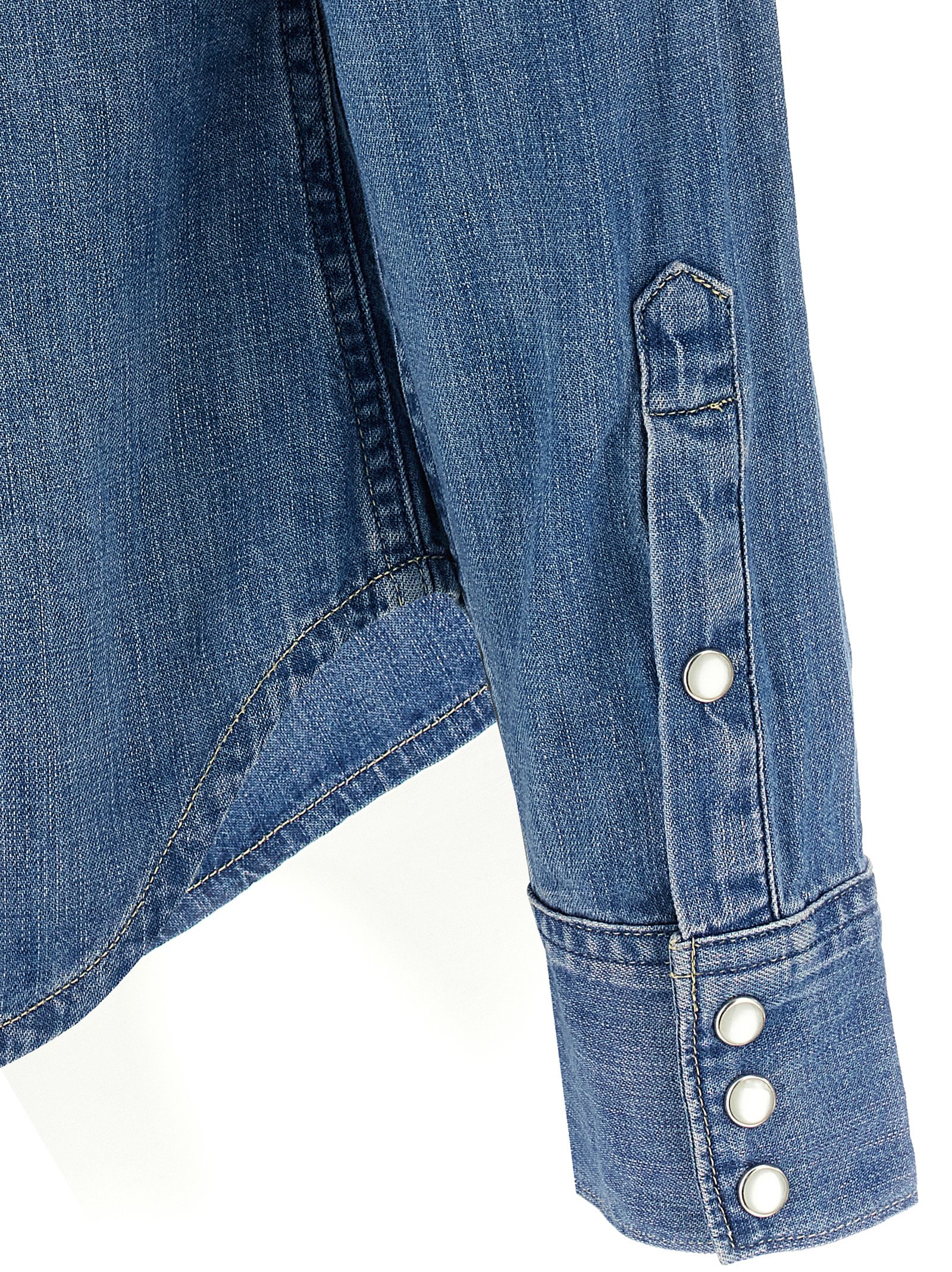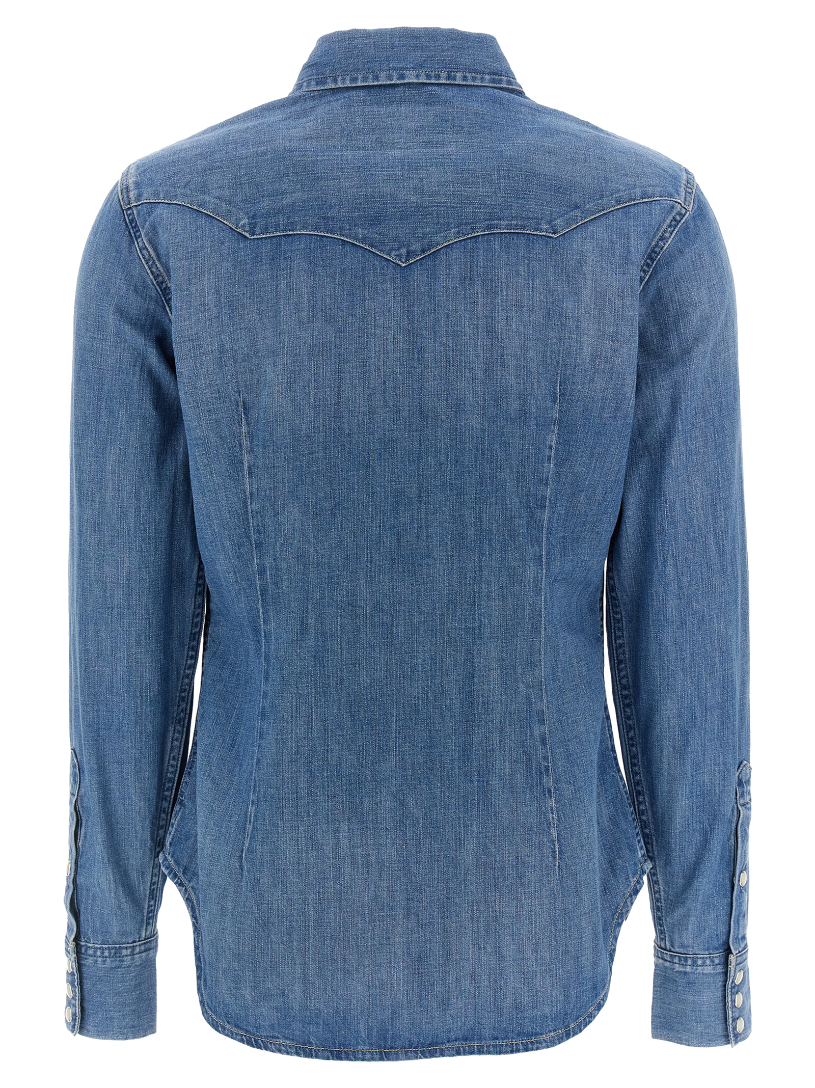 Cotton denim shirt with front snap button closure, Pockets, Long cuffed sleeves.