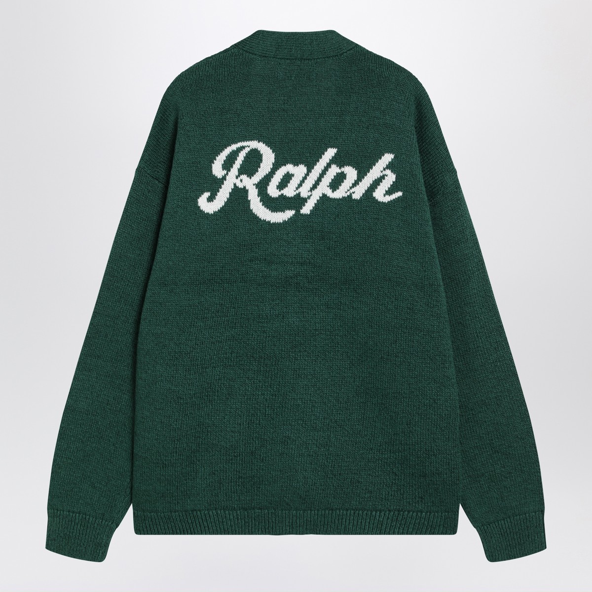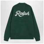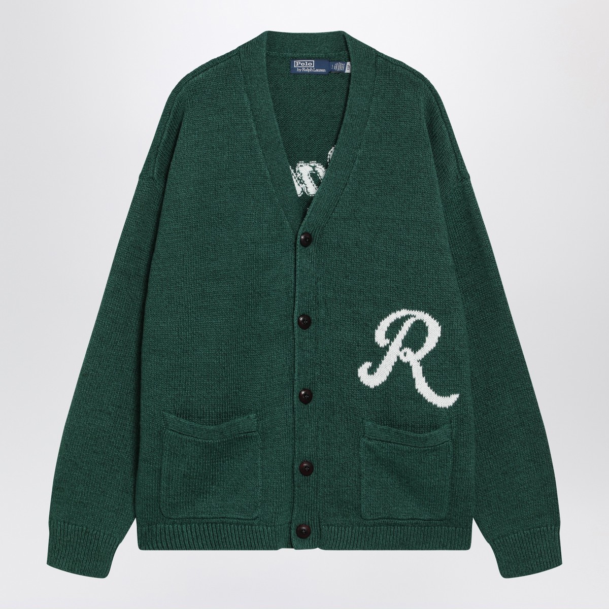 Polo Ralph Lauren forest green cotton and linen cardigan, featuring V-neckline, long sleeves, front button closure, intarsia R letter on the left chest, contrasting Ralph logo intarsia at the center back, two front patch pockets and ribbed trims.