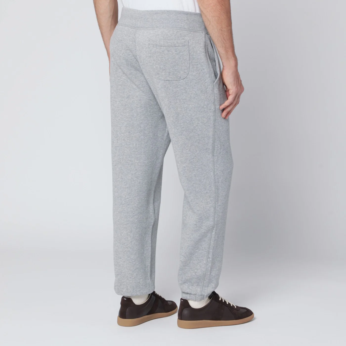 Trousers by Polo Ralph Lauren in light grey cotton blend featuring a ribbed elasticated waist with drawstring two side pockets contrasting logo embroidery on the front elasticated ankles and one patch pocket on the back.