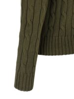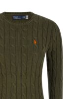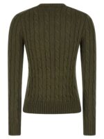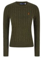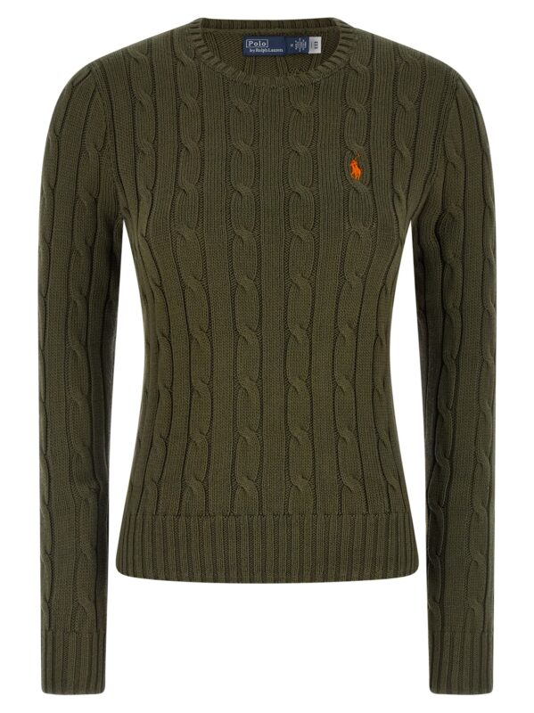 Pima ‘julianna’ cotton sweater with cable pattern, Contrast logo embroidery on the front, Crew neck, Long cuffed sleeves. Size and Fit – true to size fit
