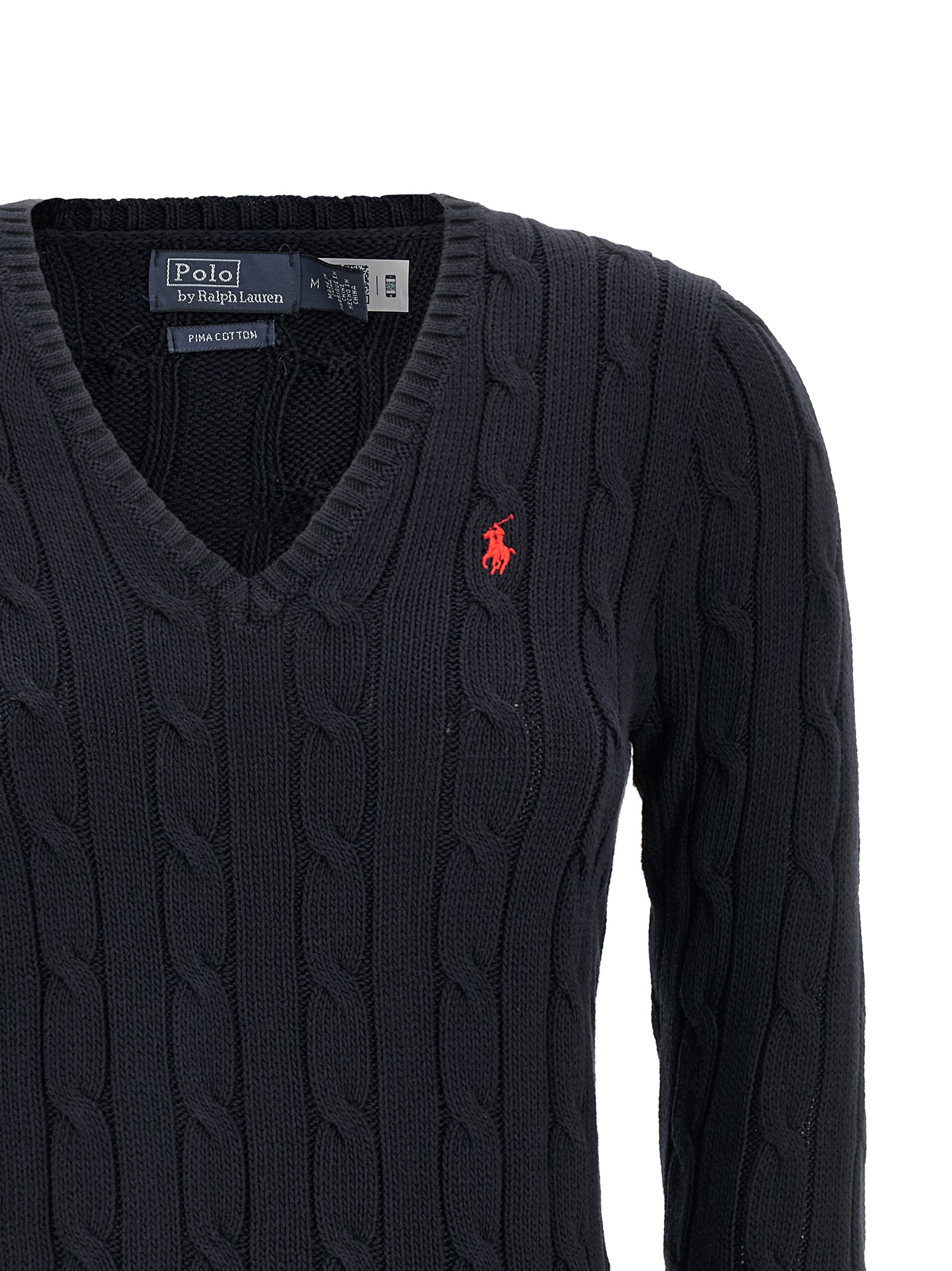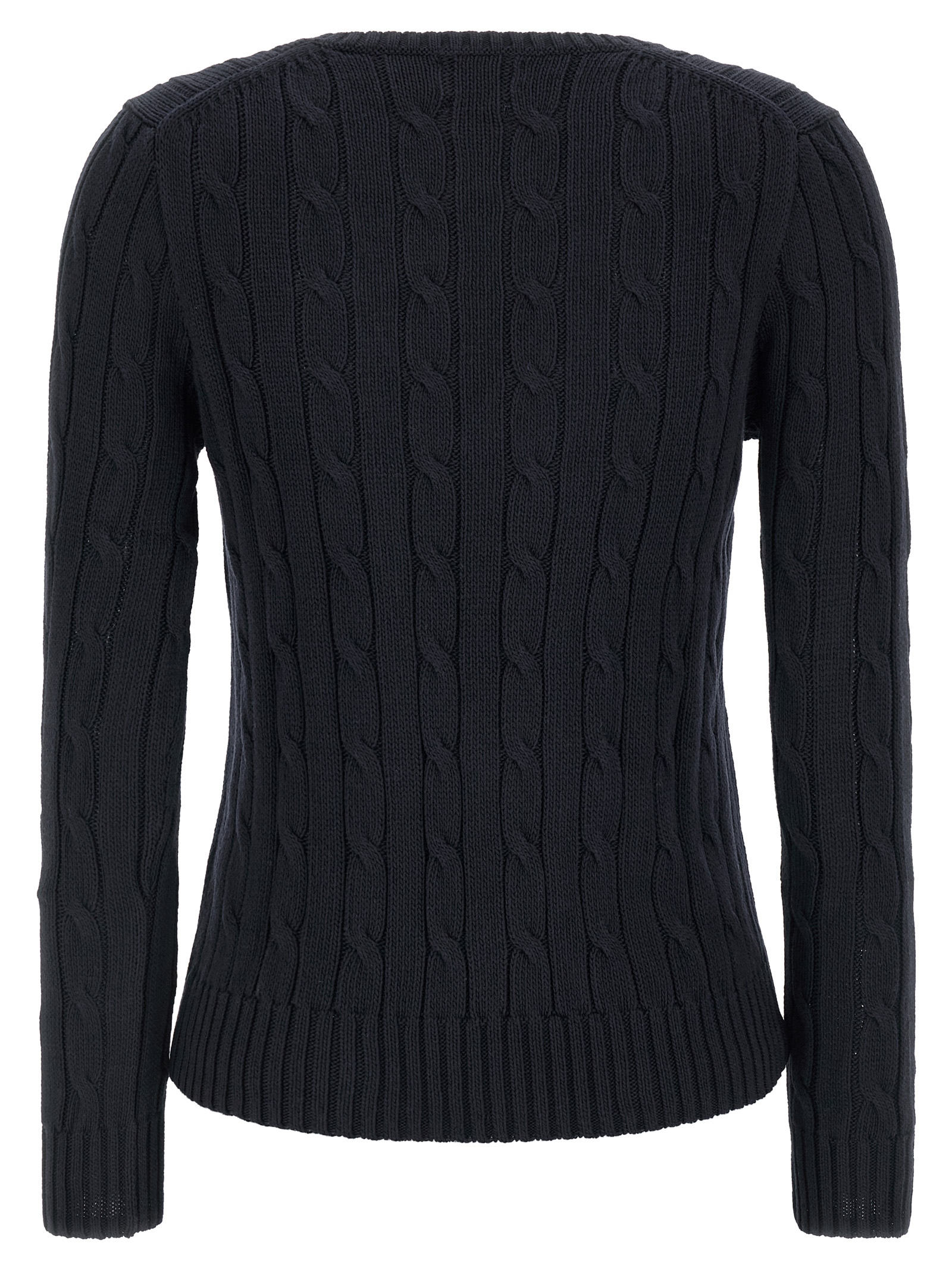 Pima cotton ‘kimberly’ sweater with cable pattern, Front contrast logo embroidery, V-neck, Long cuffed sleeves.