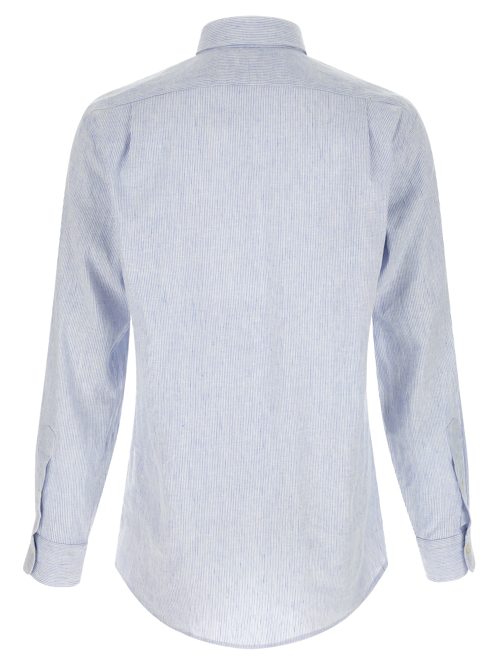 Micro-striped shirt in linen and cotton blend with contoured waistband, French collar, Contrast ‘pony’ logo embroidery and front mother-of-pearl button closure, Long cuffed sleeves, Rounded hem.