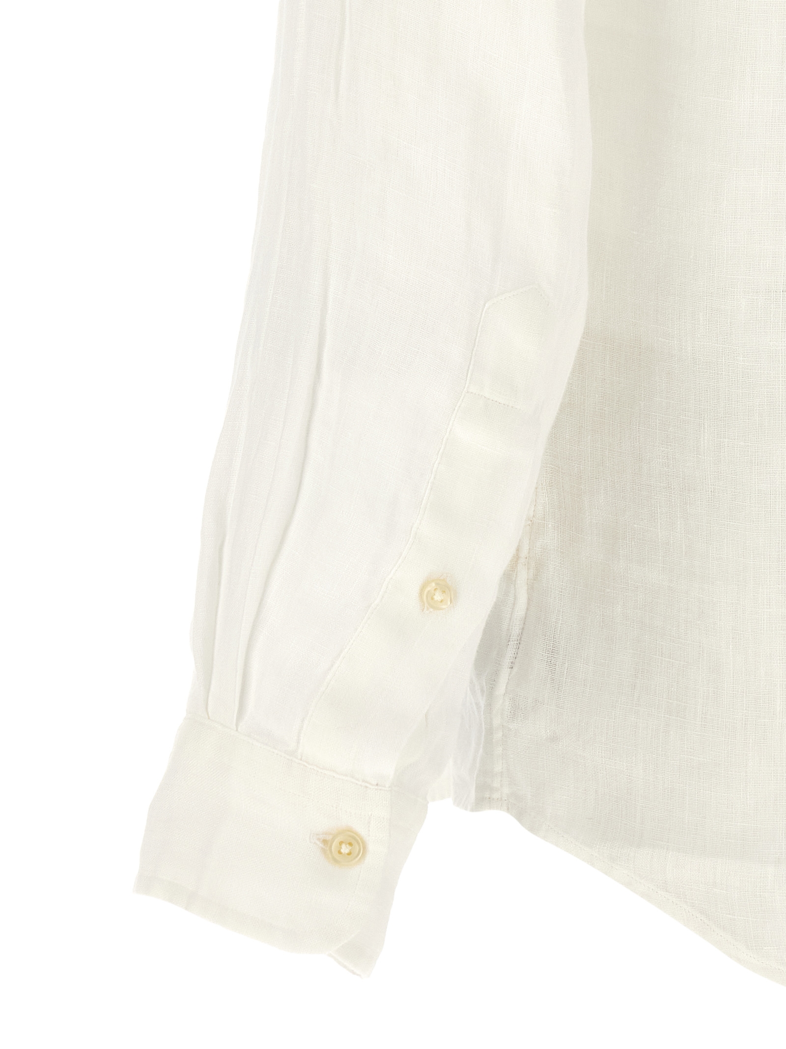 Button-down style linen shirt, ‘pony’ embroidered logo and front button closure, Long cuffed sleeves, And asymmetrical rounded hem. Size and Fit – custom fit