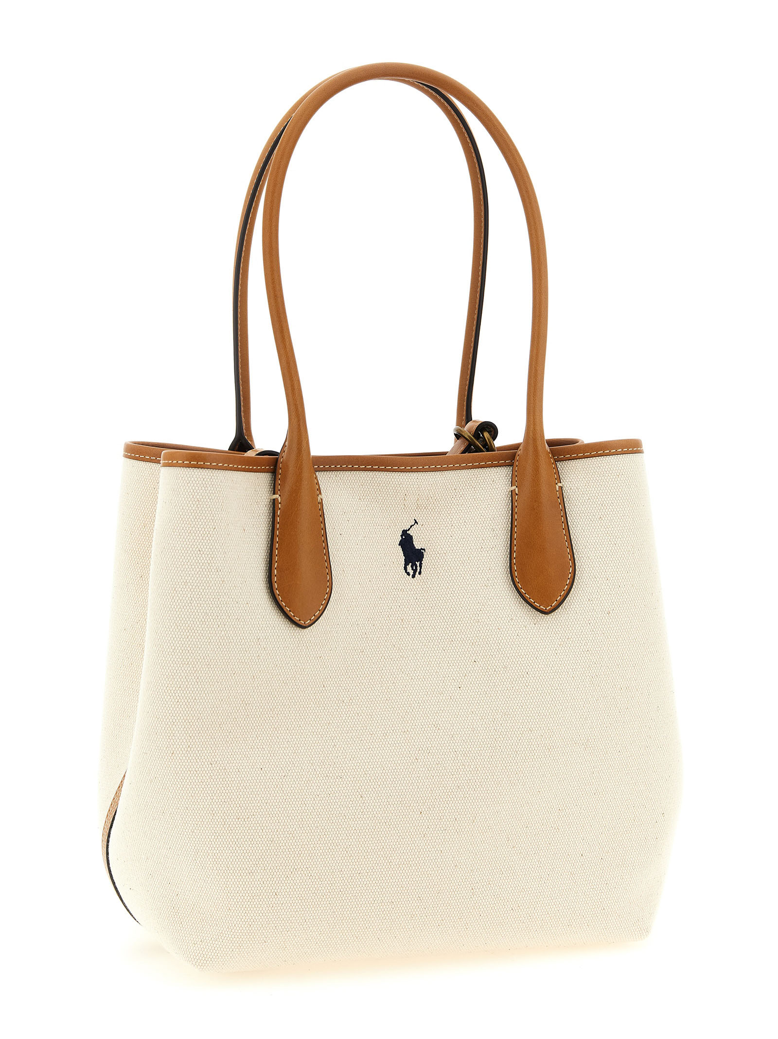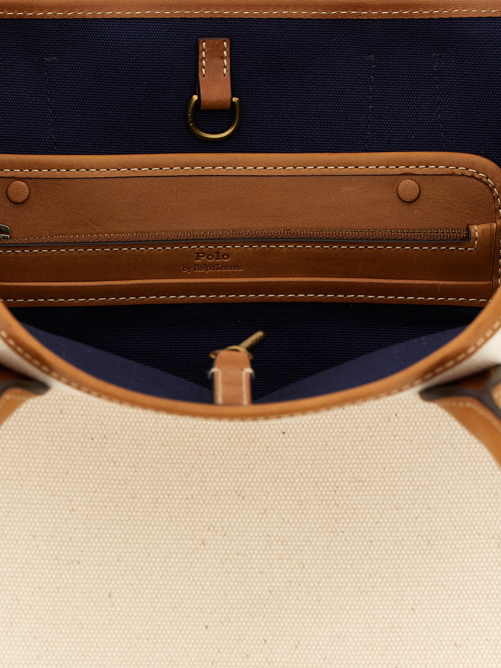 Medium shopping bag in cotton canvas canvas with contrasting smooth leather details, Front logo embroidery, Double fixed handle, Internal carabiner closure, Side strap to change its width, Base with leather feet.
