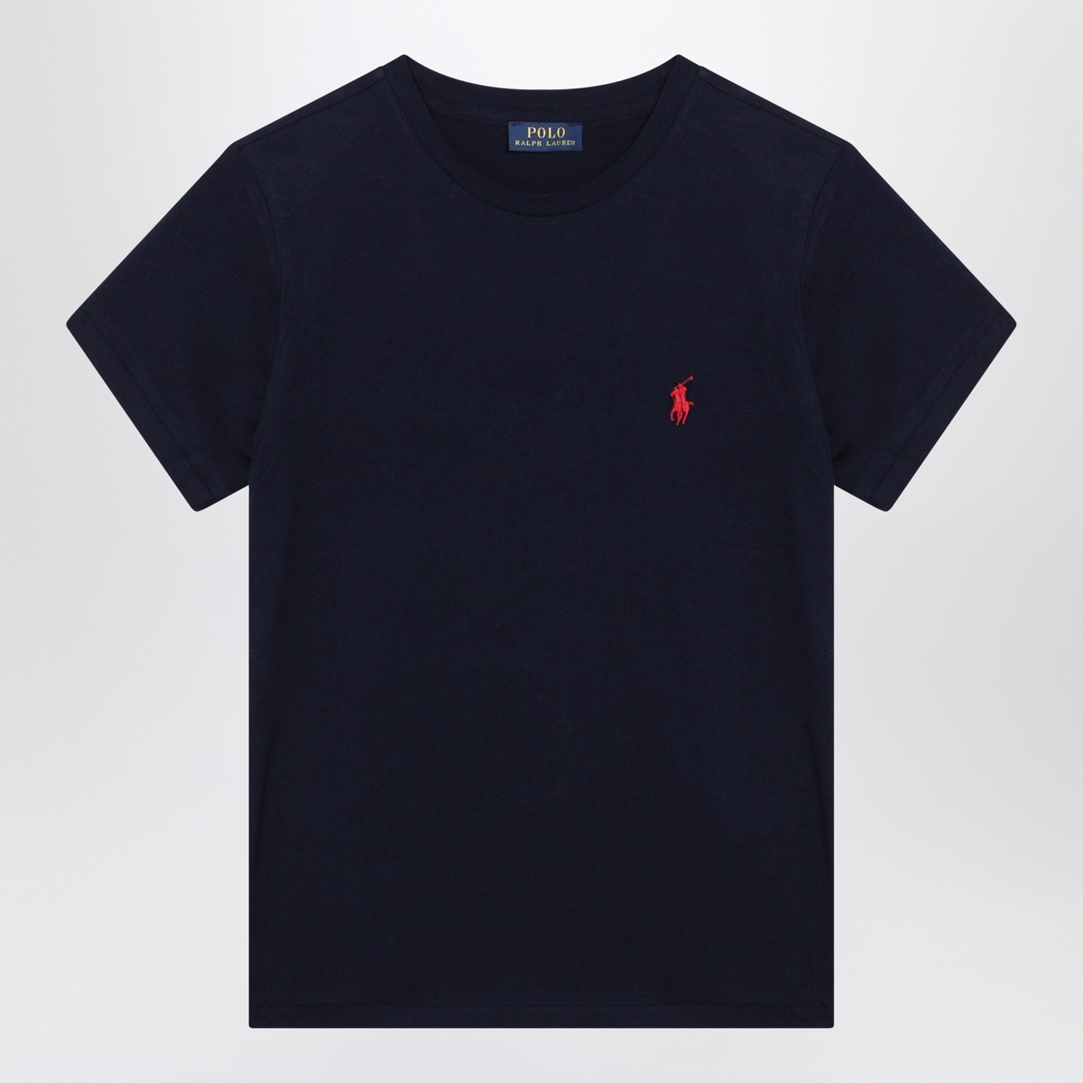 Polo Ralph Lauren navy blue cotton T-shirt, featuring short sleeves, ribbed crew neck, and contrasting embroidered logo on the chest.