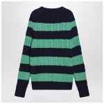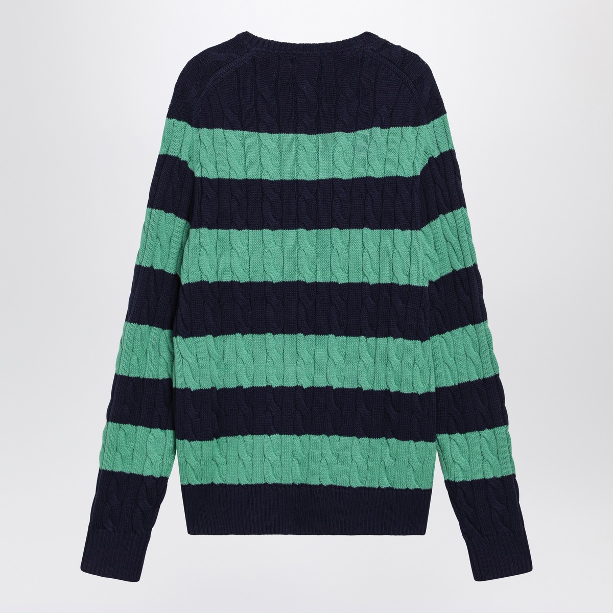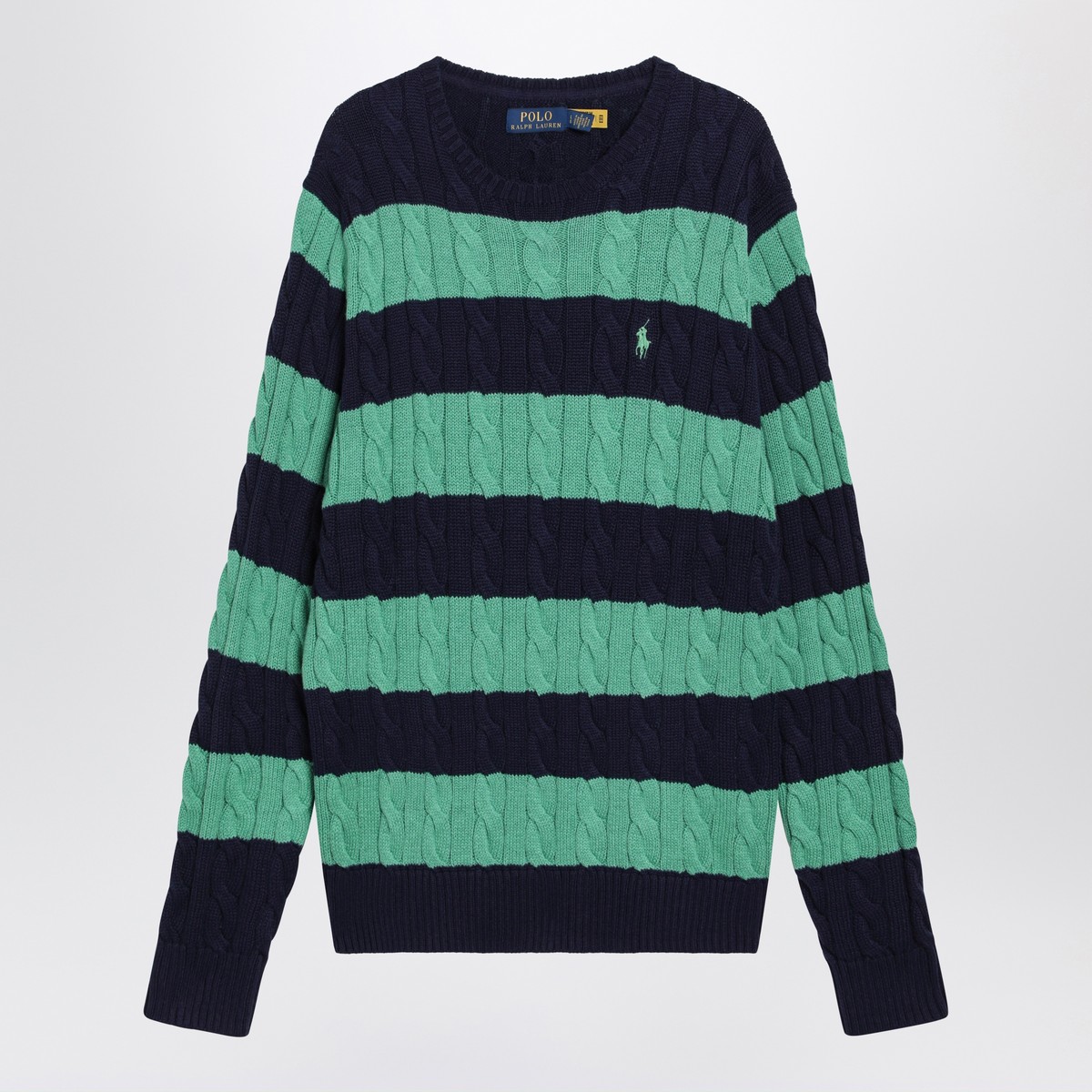 Polo Ralph Lauren crew neck jumper in navy blue and green striped cotton, featuring long sleeves, cable knit design, contrasting logo embroidery on the chest and ribbed edges.