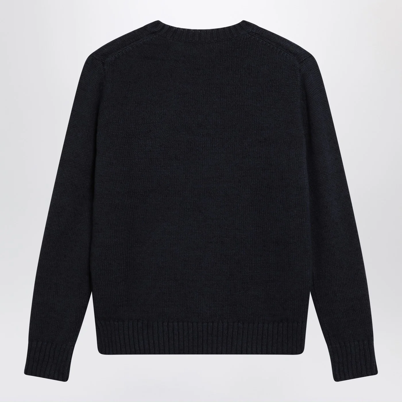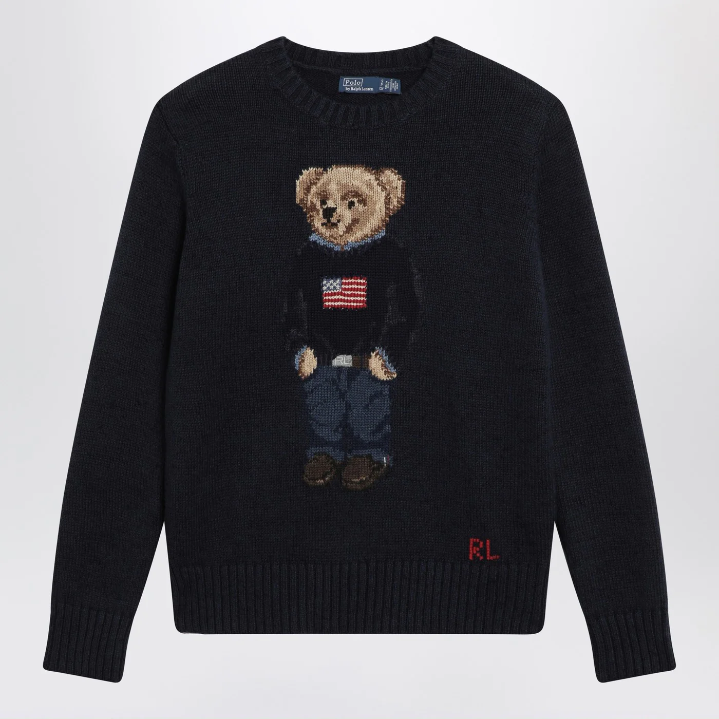 Crew-neck sweater by Polo Ralph Lauren in navy blue cotton and linen blend featuring long sleeves Polo Bear intarsia on the front and ribbed trims.