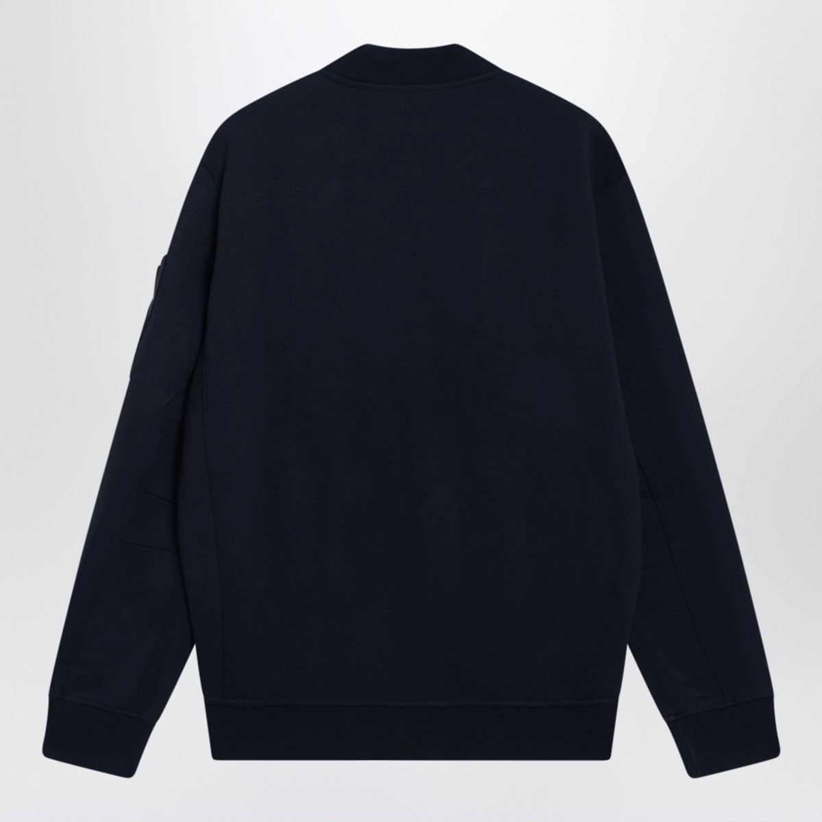 Bomber-style sweatshirt by Polo Ralph Lauren in navy cotton blend knit, featuring front zip closure, long sleeves—one with zip pocket—contrasting embroidered logo on the chest, two front flap pockets with snap buttons, and ribbed trims.