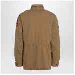 Polo Ralph Lauren beige sand cotton military jacket, featuring stand-up collar with front Velcro strap, concealed front zip and button closure, stowaway hood, four front pockets, all-over military label applications, internal drawstring waist, and long sleeves with button cuffs.