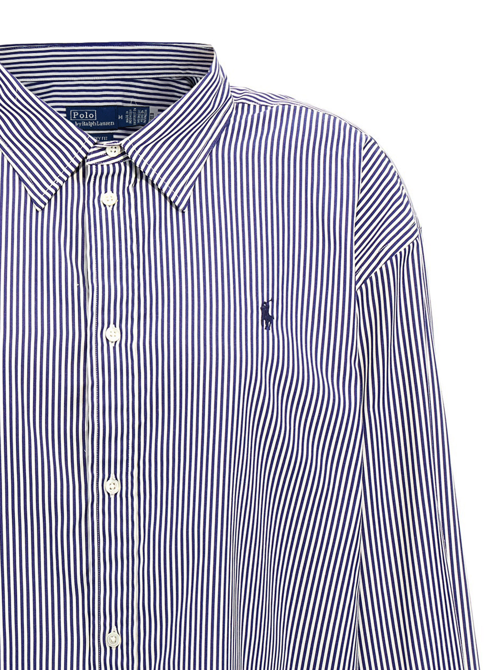 Striped cotton poplin shirt, slightly cropped style, logo embroidery and front button closure, long sleeves with cuffs and dropped shoulders, asymmetrical hem.