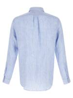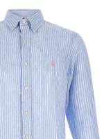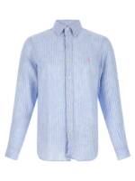 Striped linen shirt, Button-down model, ‘pony’ embroidered logo and front button closure, Long cuffed sleeves, And asymmetrical rounded hem. Size and Fit – custom fit