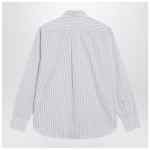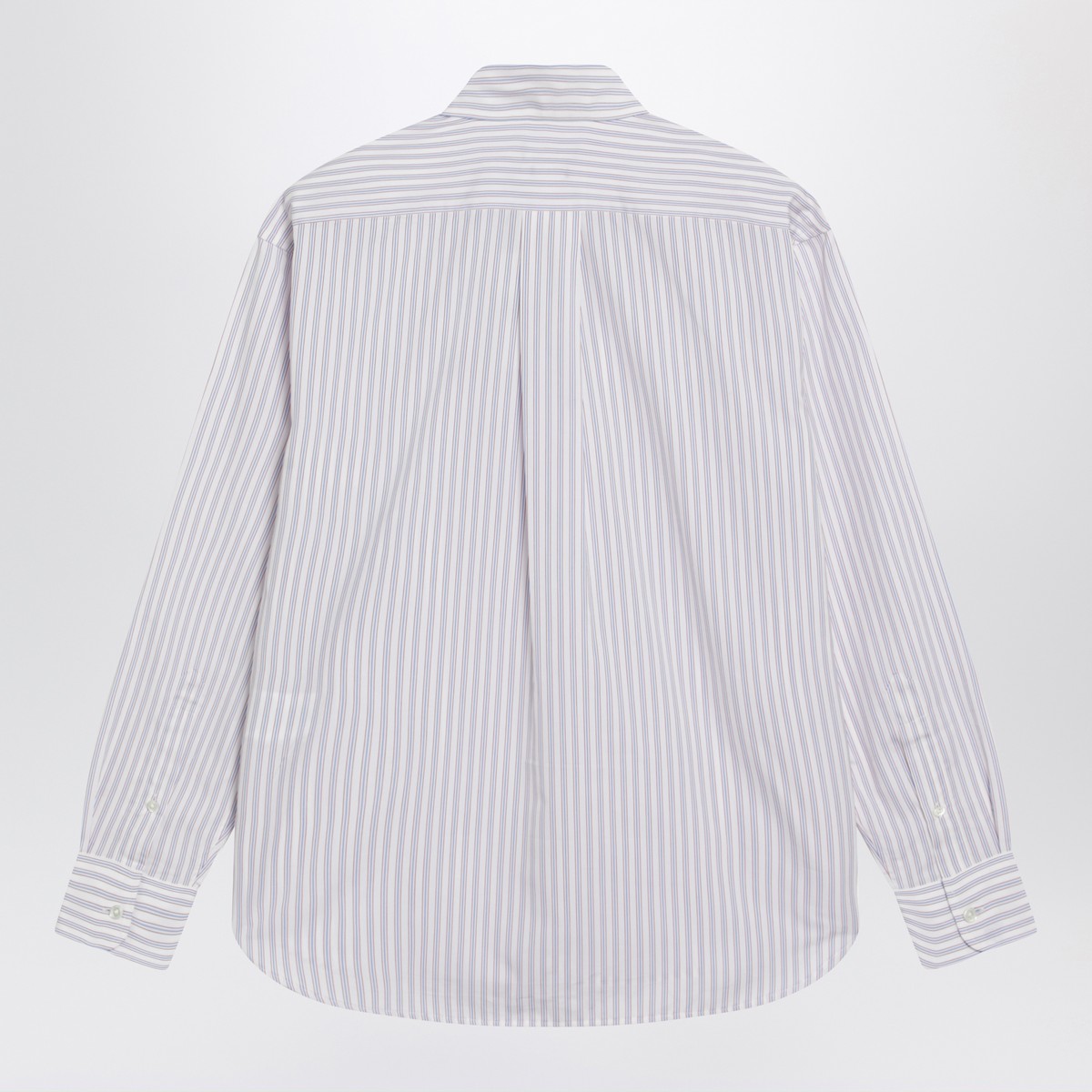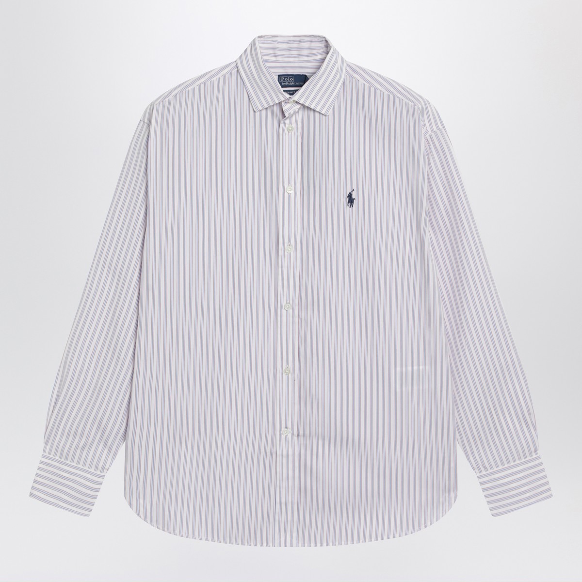 White cotton shirt by Polo Ralph Lauren with blue and red stripes, featuring front button closure, long sleeves with buttoned cuffs, embroidered chest logo, classic collar, curved hem, and relaxed fit.