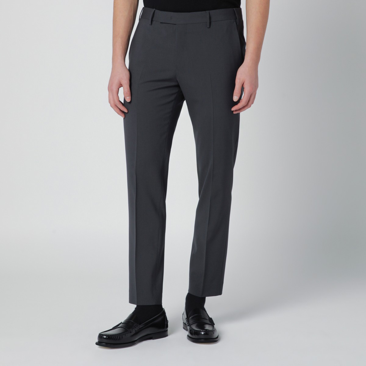 PT Torino grey virgin wool-blend trousers, featuring front zip and hook closure, two side welt pockets, belt loops with rear logo detail and two rear welt pockets.