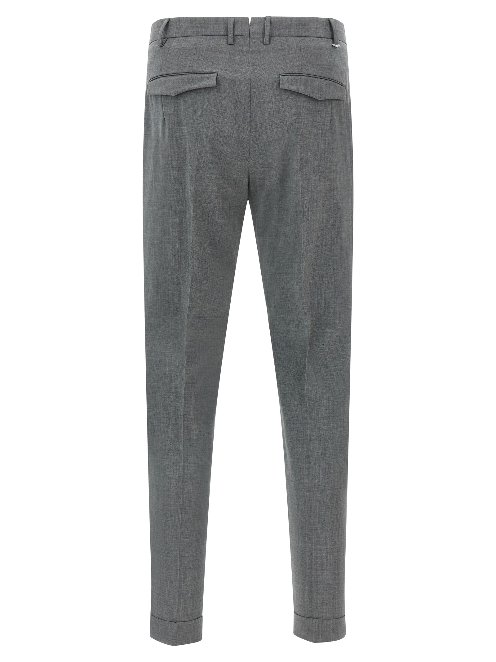 ‘master’ mélange stretch wool trousers, Transversal sartorial design, Stretched pleat, Mid waist, Zip hook and front button closure, Pockets, Turn-up on the leg bottom. Size and Fit – Slim fit