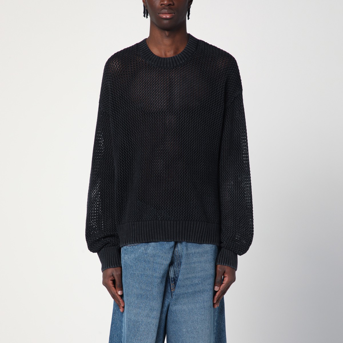 Wide crew neck sweater by Represent in black cotton knit, featuring long sleeves, perforated design, side logo tag, and ribbed edges.