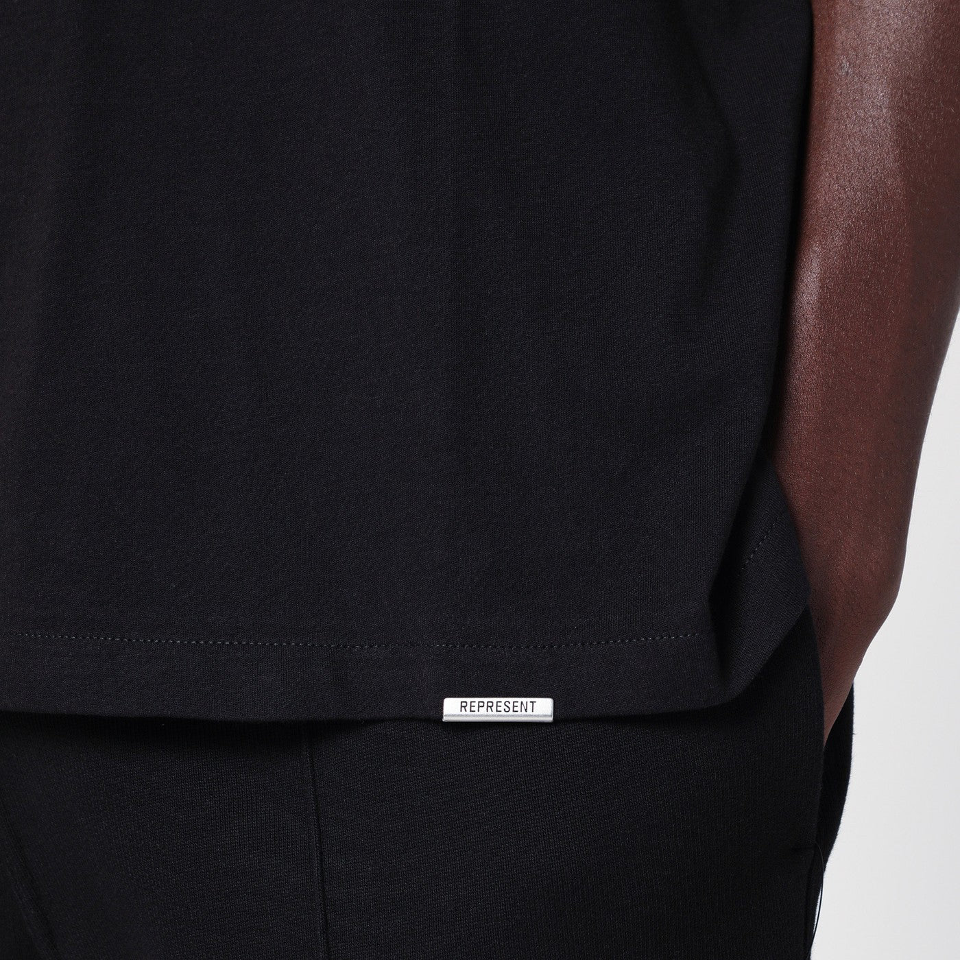 Black cotton T-shirt by Represent featuring a crew neck design short sleeves and a logo tag at the bottom.