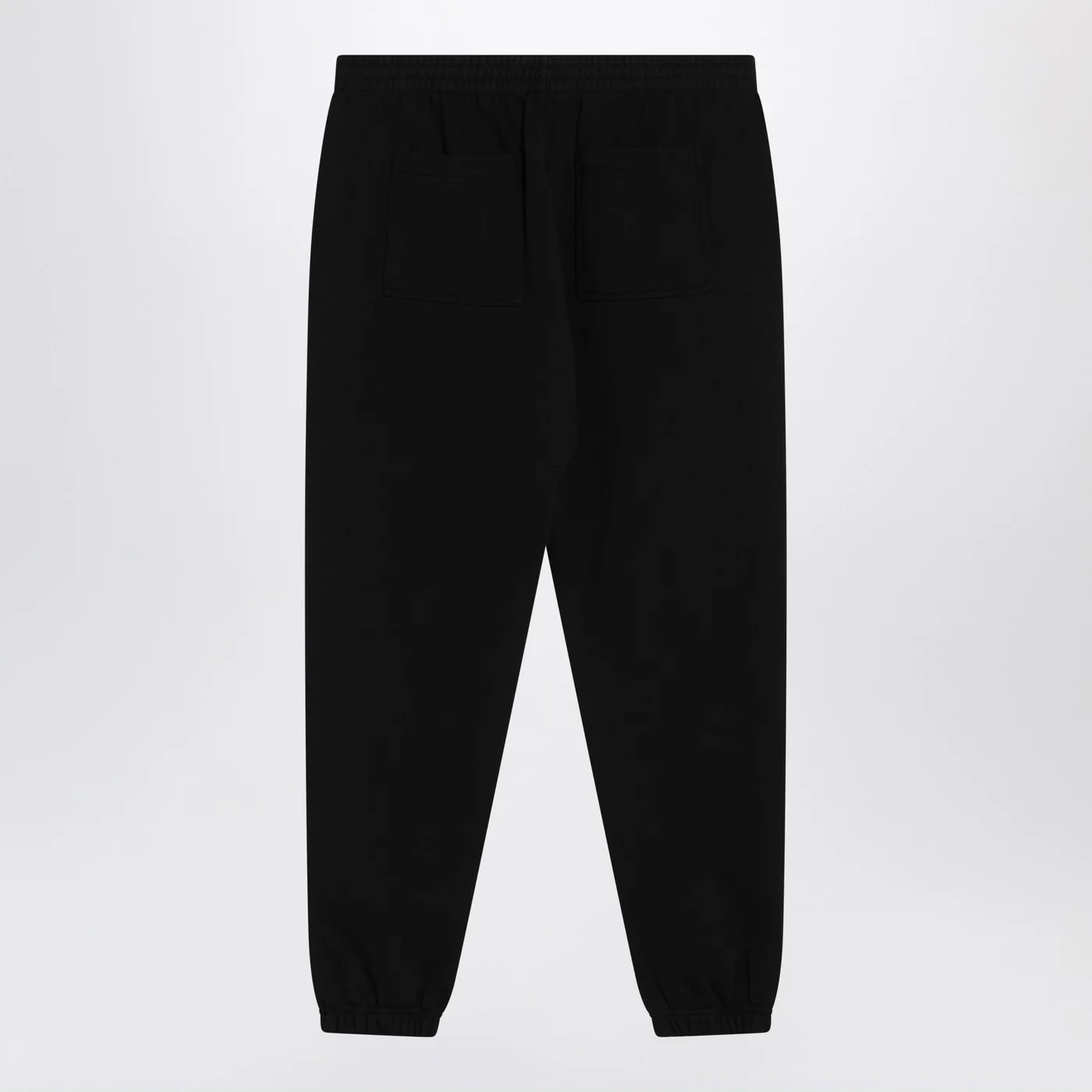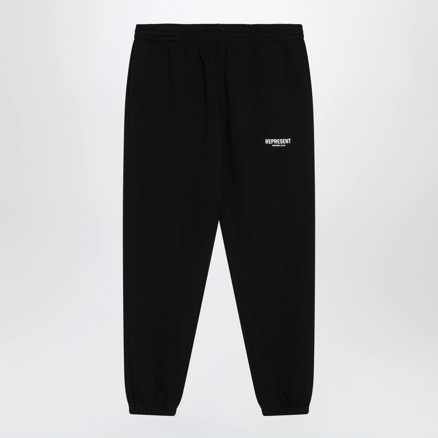 Black cotton jogging trousers by Represent featuring an elasticated waistband with drawstring lettering logo on the front two side welt pockets with logo metal detail and two patch pockets on the back. Size and Fit – Model wears size M Model measurements: Height: 187 cm Chest: 102 cm Waist: 76 cm Hips: 92 cm