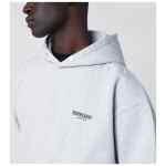 Oversized hoodie by Represent in grey cotton, featuring logo lettering print on the back, front kangaroo pocket with logo tag, ribbed edges, and logo lettering on the chest.