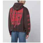 Represent reversible cotton sweatshirt, featuring a boxy oversized fit, hood, kangaroo front pocket, ribbed cuffs and hem, mixed printing technique on both sides, vintage finish, raw edges, metal logo plaque on the hem, and removable tear-away labels.
