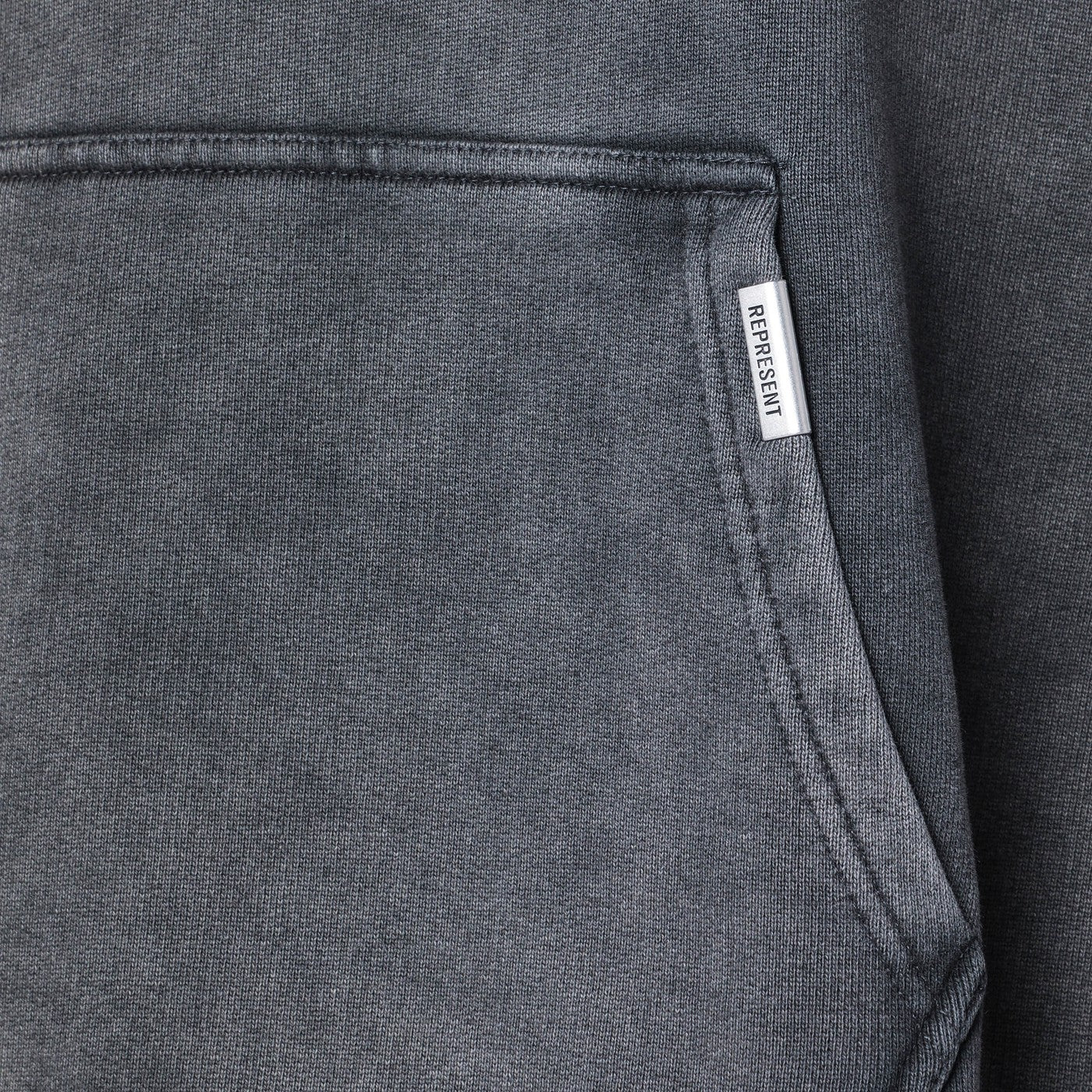 Represent sweatshirt in vintage effect gray cotton featuring a hood front kangaroo pocket with logo tag long sleeves with dropped shoulders and an oversized fit.
