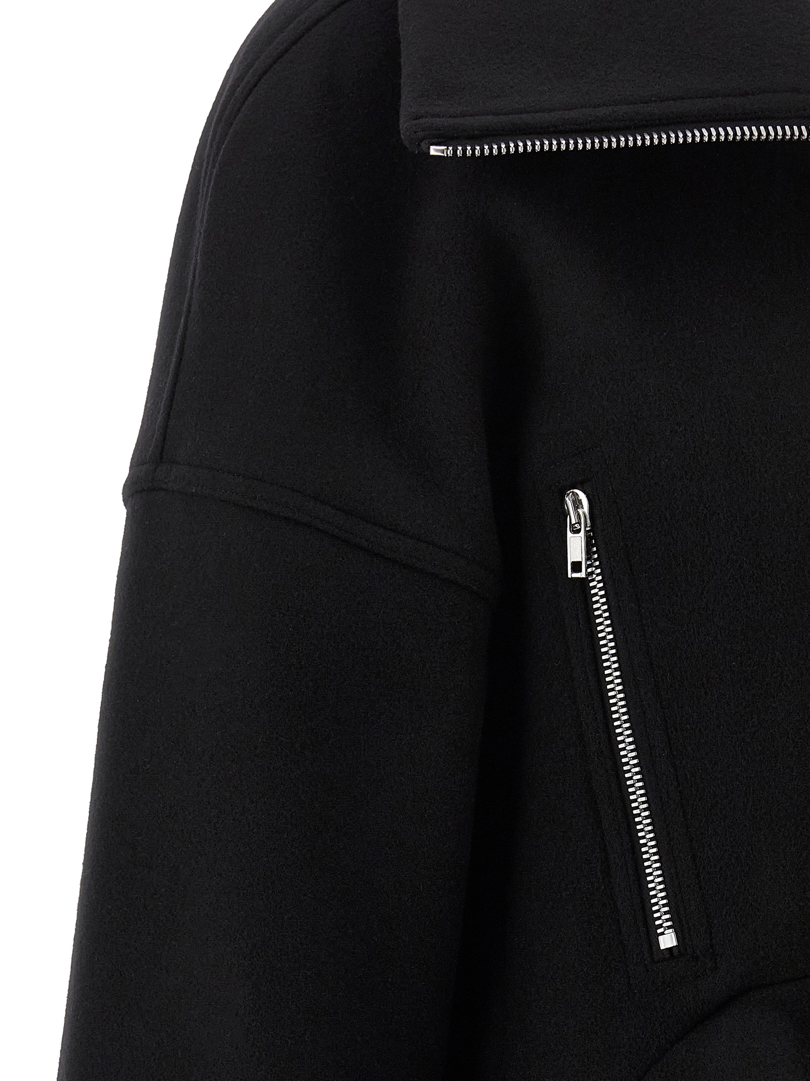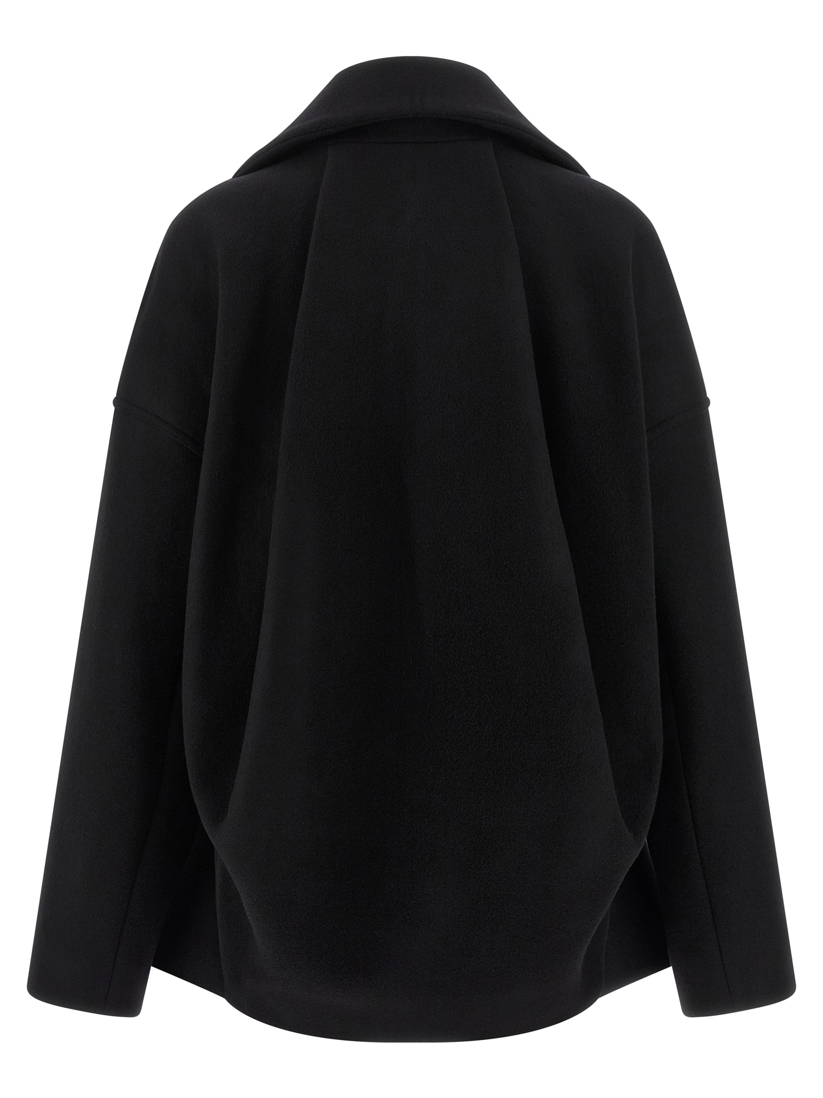 Draculimo’ virgin wool cloth coat with foldable reinforced high neck, Front zip closure, Pockets, Long sleeves with dropped shoulders, Asymmetrical hem with slightly raised curved front hem.