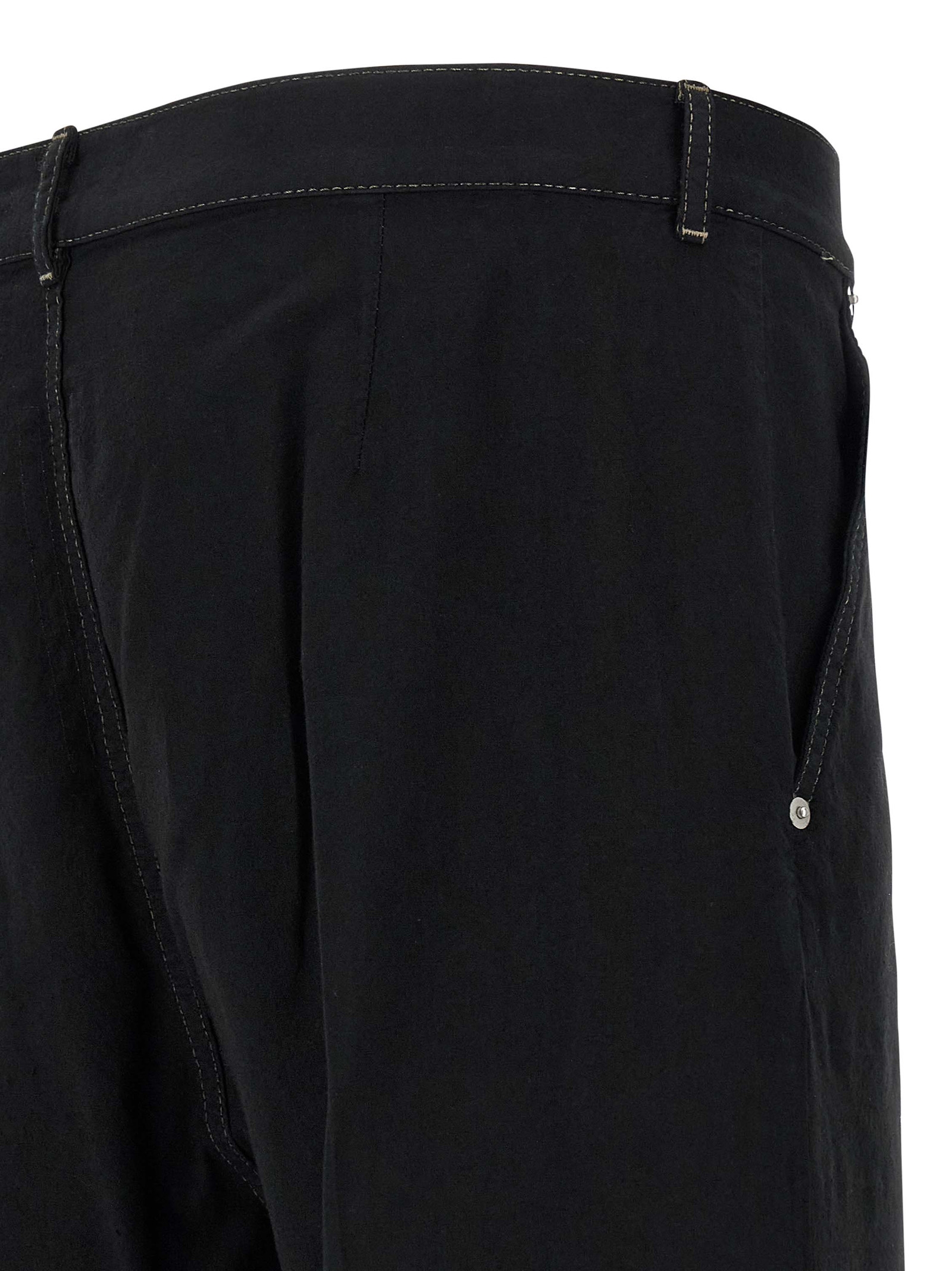 ‘Joris’ 13oz blackety denim pants and cotton canvas overdyed and then treated with a matte wax finish, front button closure, pockets, wide leg with rough and worn edging on the inside of the right leg and on the outside of the left side in tone-on-tone fabric, fringes on the leg bottom.