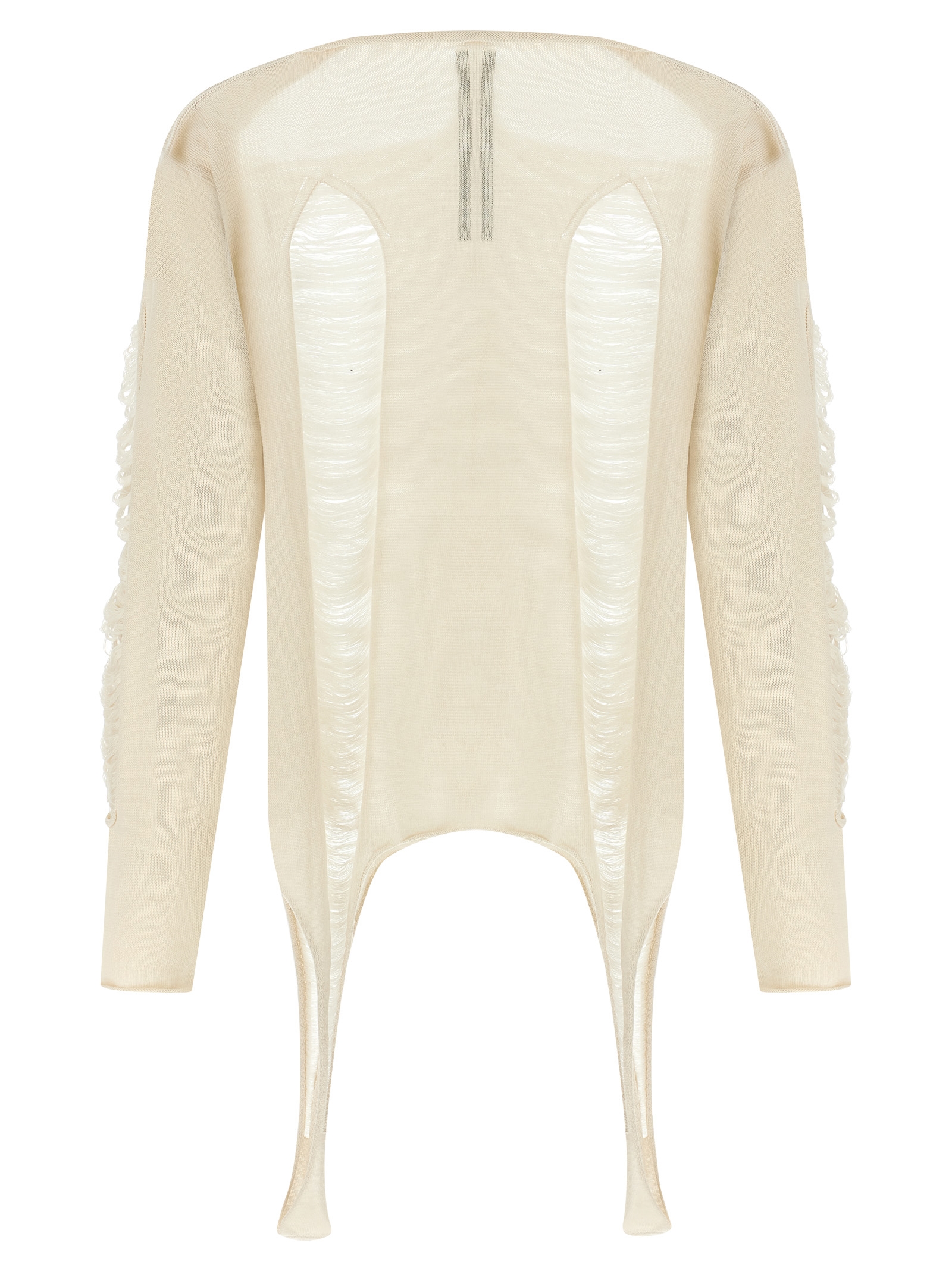 ‘LS Top’ wool sweater with fraying and cut-out details on the front and back, boat neck, long sleeves, raw cut hem.